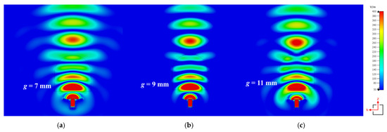 Simulated electric field distributions for different air gap values: (a) g = 7 mm, (b) g = 9 mm, and (c) g = 11 mm, used to investigate backscattering after adding the hemispherical lens antenna.