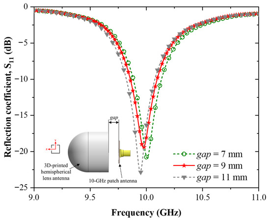 In this study, the effect of the lens radius, LR, on the antenna’s radiation performance was analyzed through parametric full-wave simulations using CST Studio Suite. The lens radius was varied from 10 mm to 30 mm in 2 mm increments, while maintaining a constant LE/LR ratio of 1.0. For each configuration, key performance metrics—including realized gain, half-power beamwidth (HPBW), and input reflection coefficient—were evaluated to determine the optimal lens geometry. Figure 3b shows the realized gain at 0° as a function of the lens radius (LR), where the value of LR is varied to determine the maximum gain of the 3D-printed hemispherical lens antenna integrated with the 10-GHz patch antenna. The results indicate that increasing the lens radius generally leads to an improvement in antenna gain. However, the gain enhancement reaches a peak value of 10.71 dBi when LR = 18 mm, beyond which the performance plateaus or slightly degrades. This behavior is attributed to increased dielectric loss and energy absorption within the lens material as its volume increases. Thus, the optimal lens radius is governed not only by focusing efficiency but also by the trade-off with material loss, which directly impacts the realized gain of the antenna. The air gap, g, is introduced to both minimize reflection at the patch–lens interface and accommodate the mechanical rotation required for beam steering. The gap was optimized using full-wave parametric simulations in CST Studio Suite to strike a balance between forward radiation enhancement and input impedance matching. The electric field distributions confirmed that g = 9 mm produces constructive wave superposition and minimal backscattering. To further validate this optimization, simulated electric field distributions for three representative gaps (g = 7 mm, g = 9 mm, and g = 11 mm) were compared, as shown in Figure 4. The reflection coefficients, S11, for the three validation gaps are plotted in Figure 5 for comparison. The maximum realized gains of the antenna for gaps of 7 mm, 9 mm, and 11 mm are 9.84 dBi, 10.71 dBi, and 9.87 dBi, respectively, confirming that g = 9 mm yields the most favorable trade-off by providing the highest gain and stable impedance matching, whereas deviations in either direction result in reduced performance. In this analysis, the electric field was observed at the same phase of 90° for all three cases to investigate the effect of backscattering. Among these cases, g = 9 mm demonstrates the most favorable trade-off, providing enhanced forward radiation and reduced backscattering.