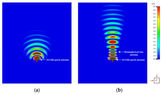 Electric field distribution in the xz-plane at 10 GHz: (a) standalone 10-GHz patch antenna and (b) patch antenna integrated with the 3D-printed hemispherical lens.
