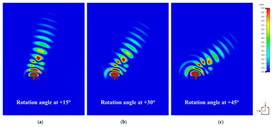 Simulated electric field distributions of the hemispherical lens antenna in the xz-plane at different rotation angles: (a) +15°, (b) +30°, and (c) +45°.