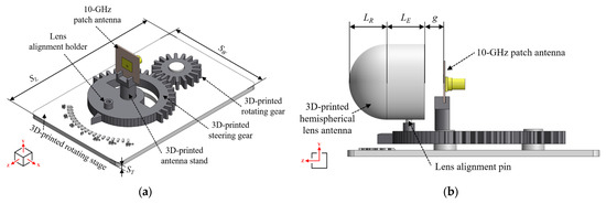 The rotating system is designed to support and facilitate the mechanism required for implementing the beam-steering structure. The proposed system fixes the antenna source, which is a 10-GHz patch antenna, while enabling the hemispherical lens antenna to rotate at specified angles. This rotation is employed to redirect the main lobe of the antenna toward a desired target angle. In this study, the rotating system focuses on achieving beam steering within a range of −45° to +45°, with increments of 5°. Figure 8a presents a perspective view of the rotating system, showcasing the 10-GHz patch antenna mounted on a 3D-printed stand, and Figure 8b shows the side view of the complete rotating system integrating the 10-GHz patch antenna and the hemispherical lens antenna.
