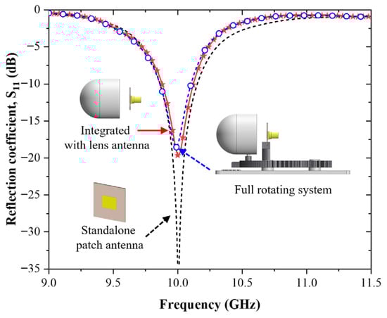 The simulated reflection coefficient, S11, of three configurations: the standalone patch antenna, the lens-integrated antenna, and the complete rotating system.