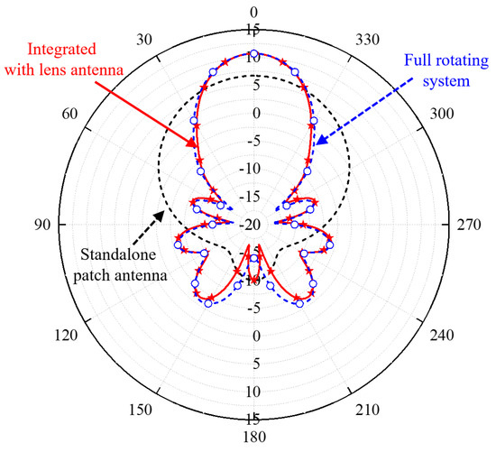 The simulated polar-plotted radiation pattern of three configurations: the standalone patch antenna, the lens-integrated antenna, and the complete rotating system.