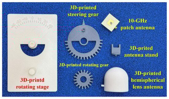 All fabricated components of the full rotating system, including the 10-GHz patch antenna, 3D-printed hemispherical lens antenna, 3D-printed rotating stage, 3D-printed steering gear, 3D-printed rotating gear, and 3D-printed antenna stand.
