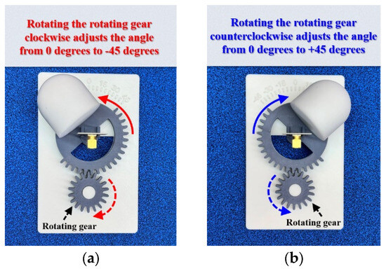 Once all components are assembled, as illustrated in Figure 13, rotating the rotating gear in a clockwise direction causes the steering gear to rotate counterclockwise, resulting in a negative angular rotation of the hemispherical lens, as shown in Figure 13a. Conversely, rotating the rotating gear in a counterclockwise direction causes the steering gear to rotate clockwise, producing a positive angular rotation of the hemispherical lens, as shown in Figure 13b.