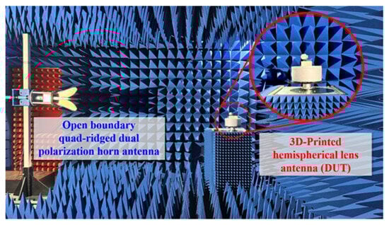 The experimental setup, featuring the 3D-printed lens antenna and the standard horn antenna inside the anechoic chamber, is shown in Figure 14.