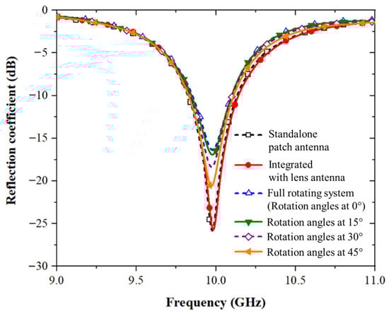 Measured reflection coefficient (S11) of the antenna for six configurations: standalone patch antenna, integrated with lens antenna, full rotating system (rotation angles at 0°), and the rotating system at angles of 15°, 30°, and 45°.