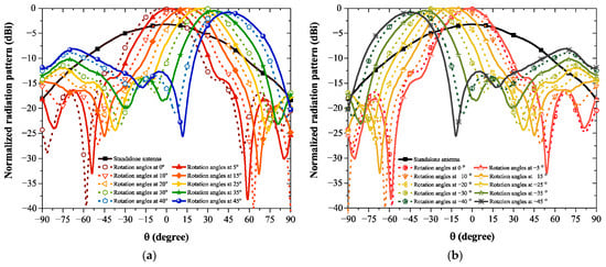 Measured and normalized radiation patterns of the fabricated prototype. The black line represents the standalone patch antenna at 0°, while the other traces show the patch antenna with the hemispherical lens rotated: (a) positive angular rotations and (b) negative angular rotations.