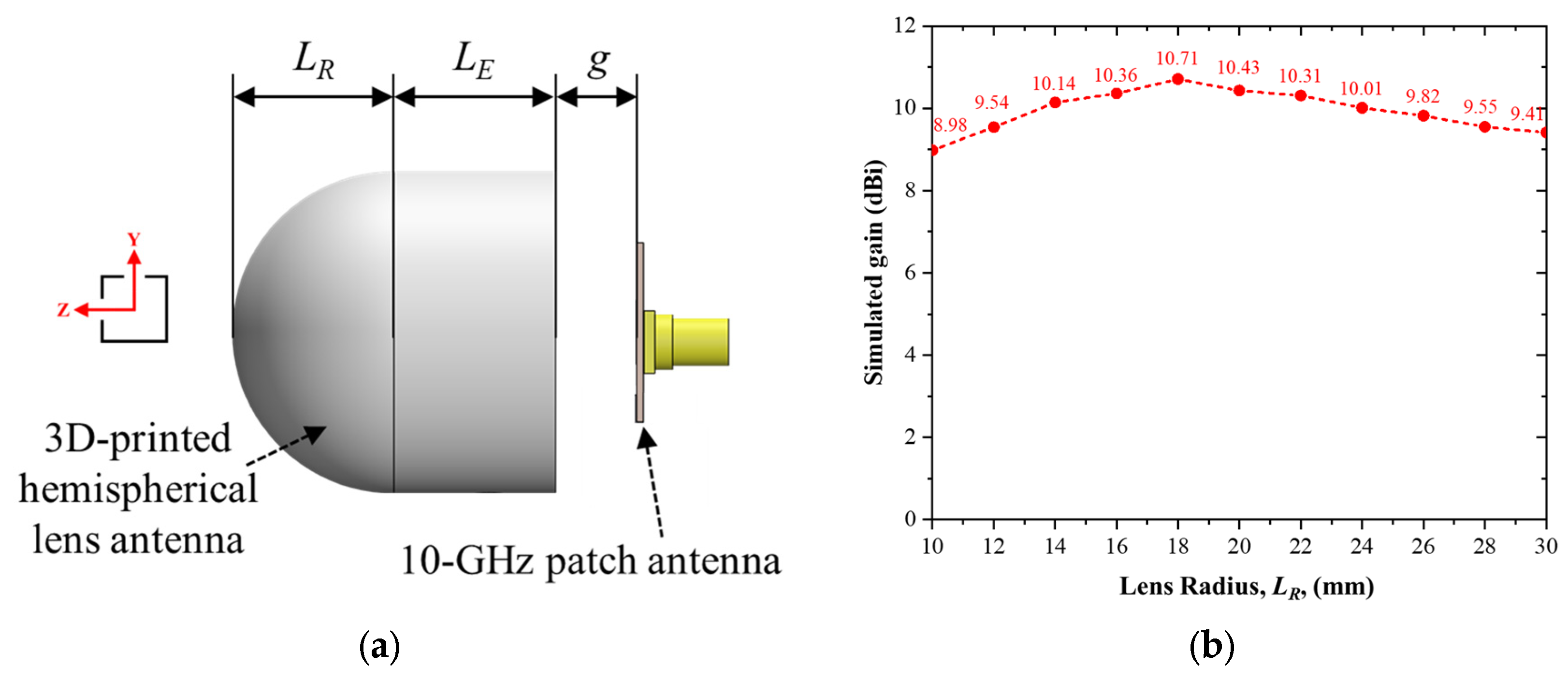 Although Luneburg lenses are well known for their superior gain and wide-angle performance, their realization requires gradient-index dielectric profiles that are challenging to achieve using low-cost commercial resins and desktop 3D printers. By contrast, the hemispherical lens used in this study can be fabricated with a uniform dielectric material, providing a practical balance between ease of manufacturing, compactness, and acceptable gain enhancement. This makes the hemispherical configuration particularly suitable for proof-of-concept demonstrations and accessible implementations, while Luneburg lenses remain better suited for high-performance applications that justify more complex fabrication processes.