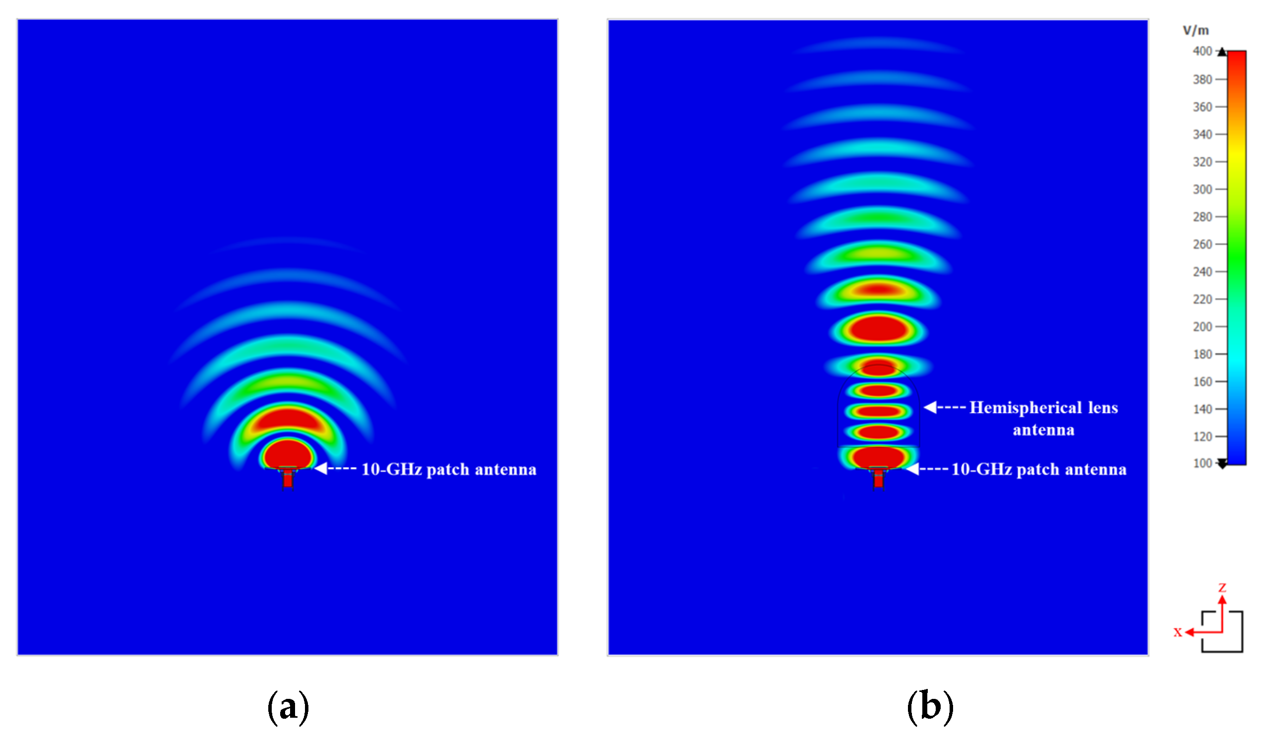 xz-plane at the operating frequency of 10 GHz, illustrating the radiation characteristics of the standalone patch antenna and the integrated hemispherical lens antenna, respectively. The results clearly indicate that the addition of the 3D-printed lens leads to improved field collimation and stronger forward radiation, confirming its effectiveness in enhancing antenna directivity.