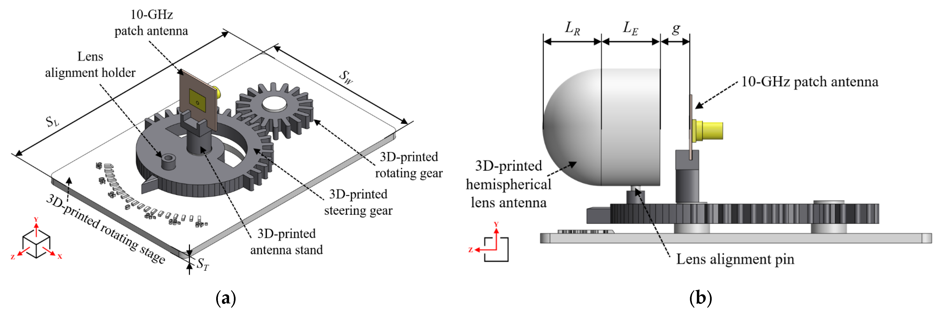 The system is composed of three main sections: a 10-GHz patch antenna, a 3D-printed hemispherical lens, and a 3D-printed rotating system. This section describes the design, fabrication, and assembly details of the proposed system. The CST Studio Suite [