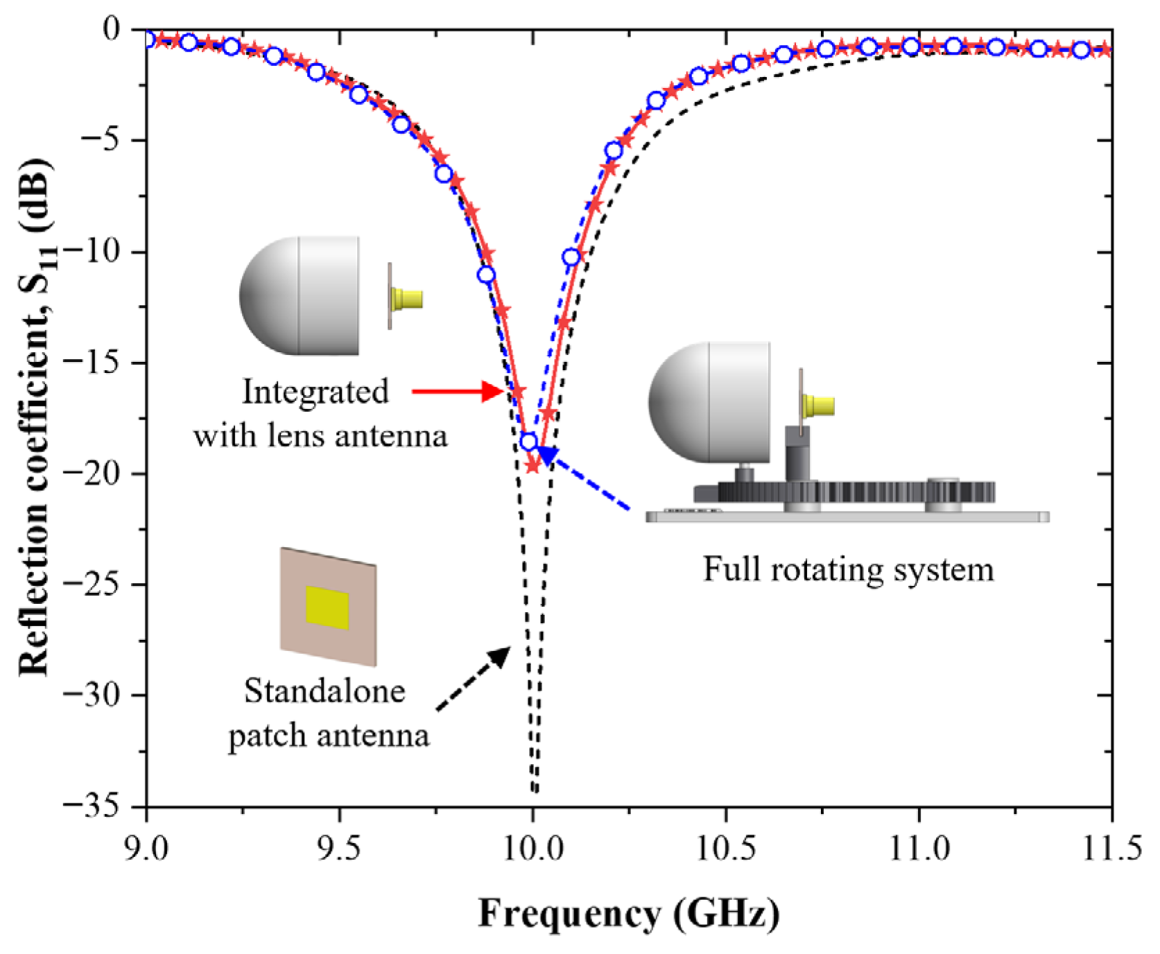 11, for three configurations: the standalone patch antenna, the lens-integrated antenna, and the complete rotating system. The results indicate that the full rotating system exhibits a slight variation in S