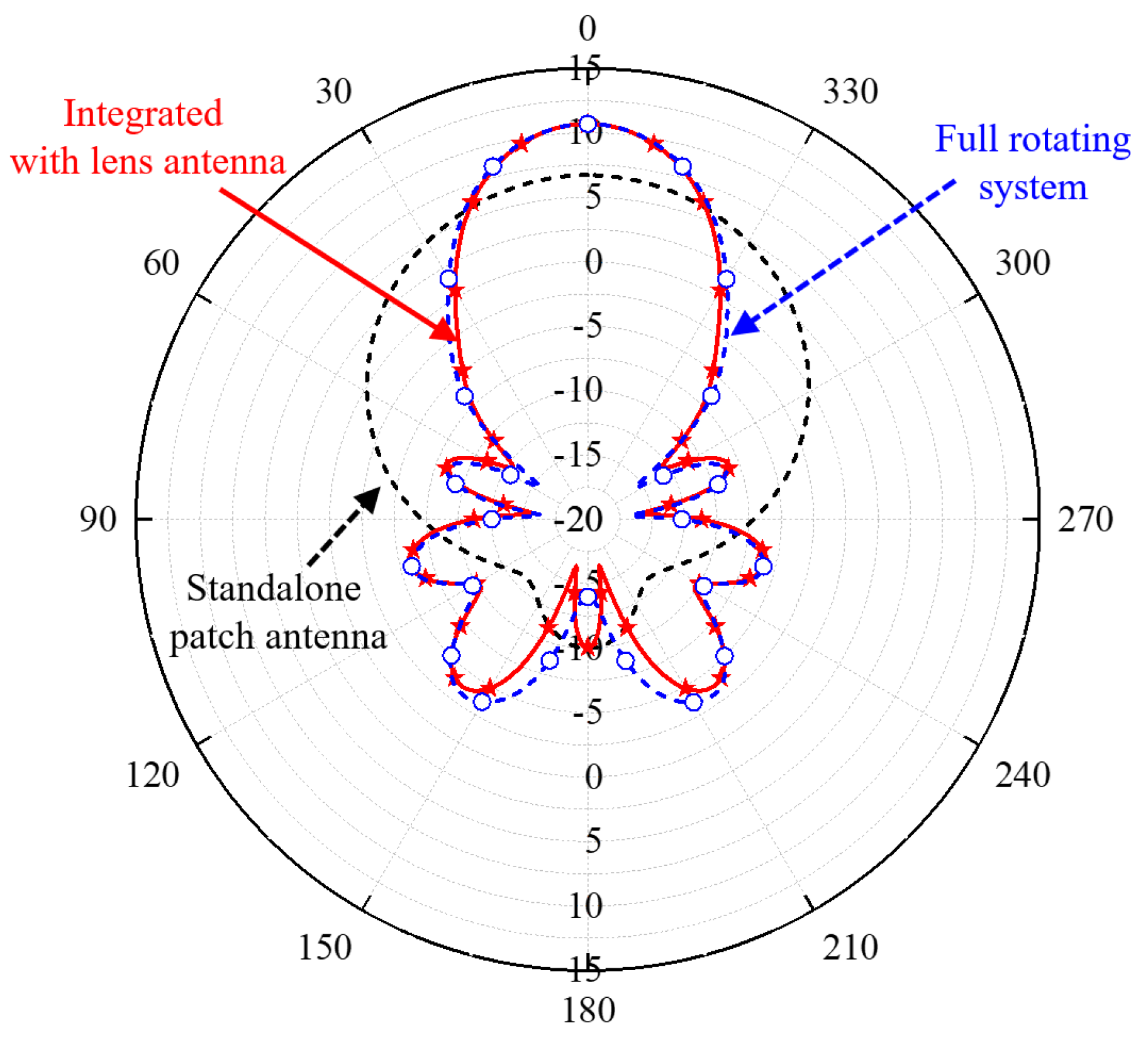 Figure 10 presents the radiation patterns for the three configurations. The black dashed line represents the radiation pattern of the standalone 10-GHz patch antenna, which achieves a gain of 6.7 dBi and a half-power beamwidth (HPBW) of 76.9 degrees. The red solid line and blue dashed line correspond to the lens-integrated antenna and the complete rotating system, respectively. With the lens-integrated antenna, the gain improves to 10.71 dBi with an HPBW of 32.7 degrees. In comparison, the full rotating system achieves a gain of 10.67 dBi and an HPBW of 34.4 degrees, demonstrating minimal degradation while maintaining enhanced performance.