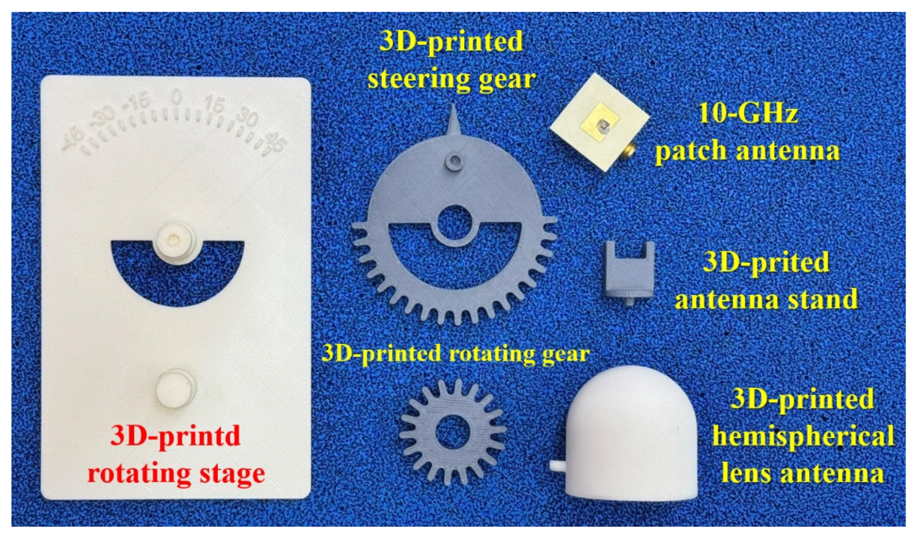 Figure 12 illustrates all components of the complete rotating system, which includes the 10-GHz patch antenna, 3D-printed hemispherical lens antenna, 3D-printed rotating stage, 3D-printed steering gear, 3D-printed rotating gear, and 3D-printed antenna stand. The assembly process is as follows: