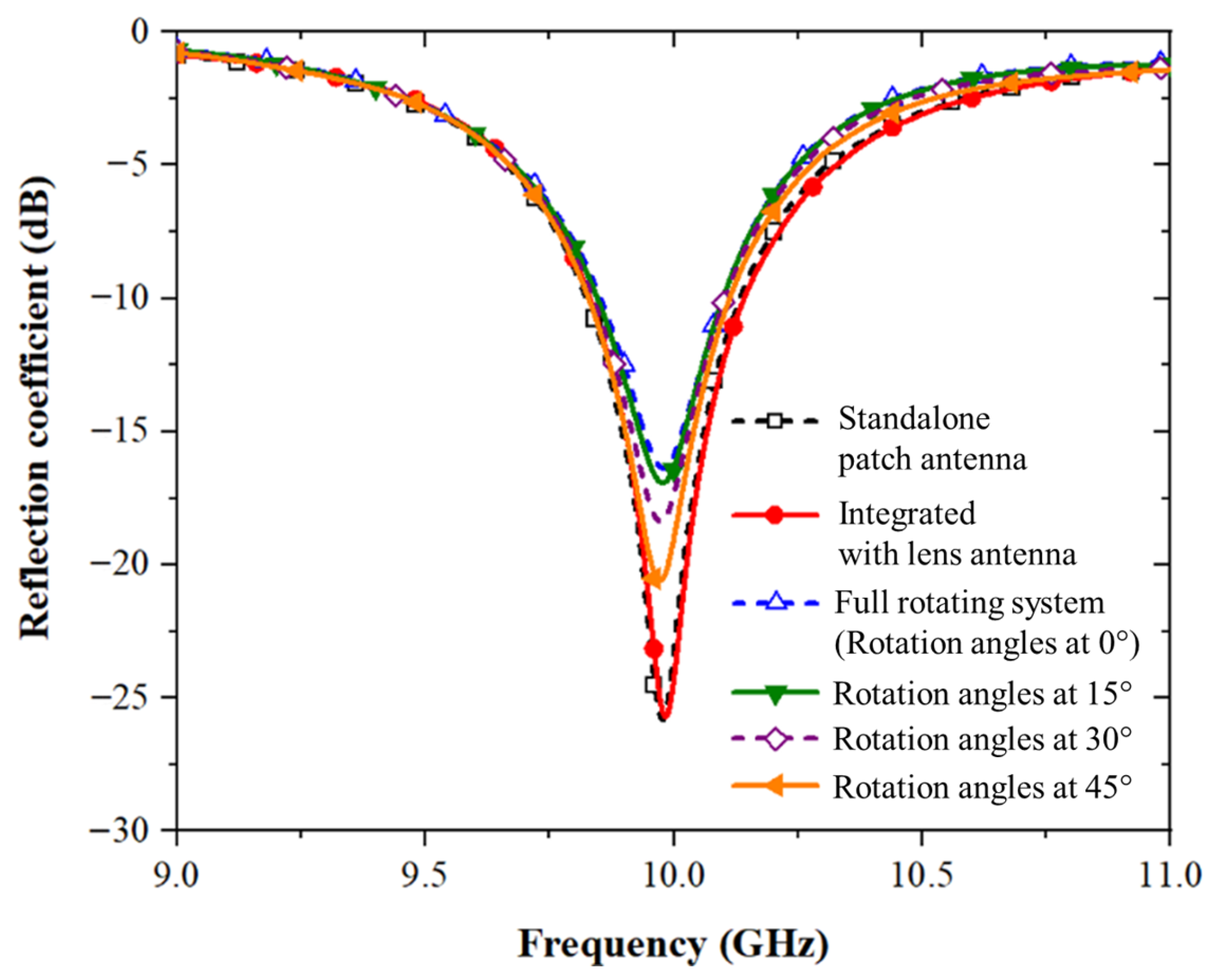 11) of the antenna, both with and without the 3D-printed mechanical lens assembly. The operating frequency for all measurements is set at 10 GHz. In the figure, the standalone antenna (black dotted line) exhibits an S