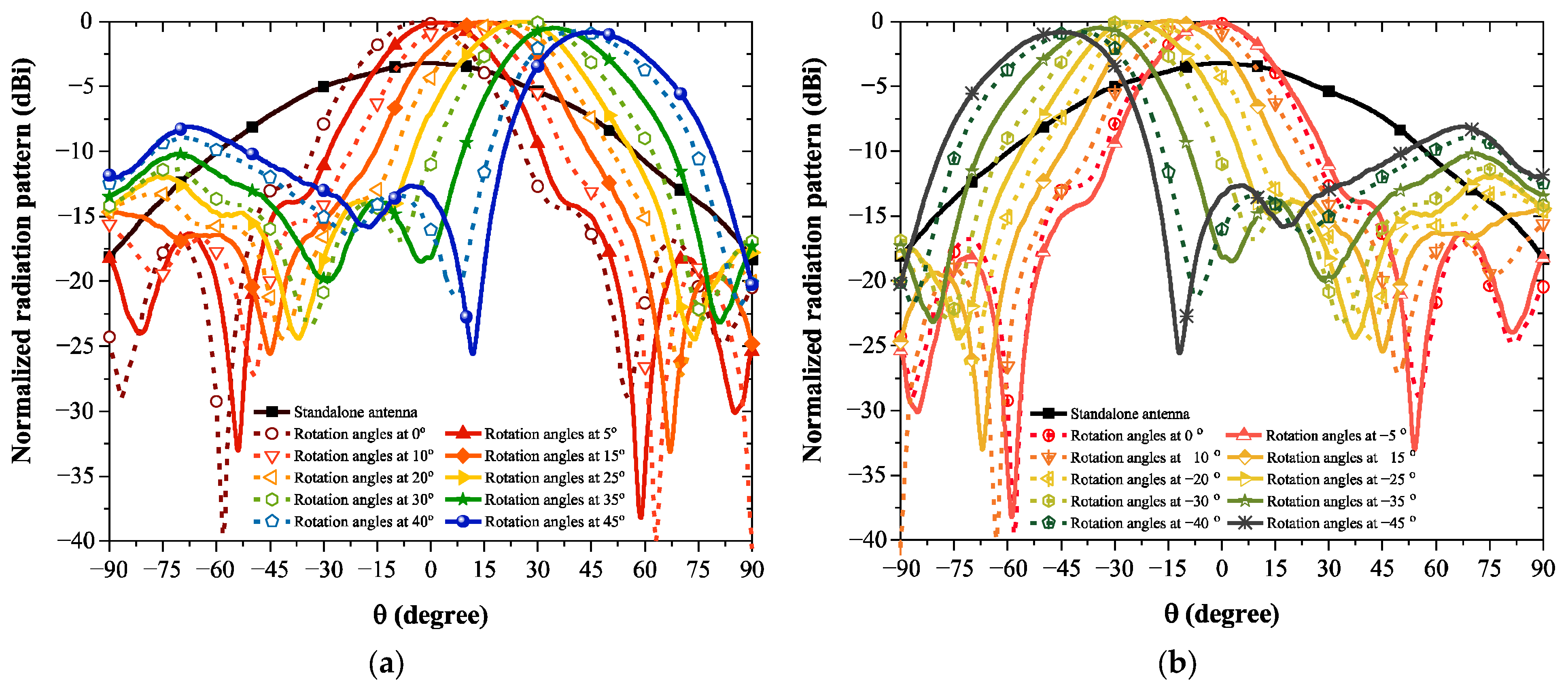 Figure 16 presents the measured results of the patch antenna integrated with the hemispherical lens, where the lens was rotated from −45° to +45° while keeping the feed fixed. These results confirm that the main beam follows the rotation of the lens, demonstrating the beam-steering principle.