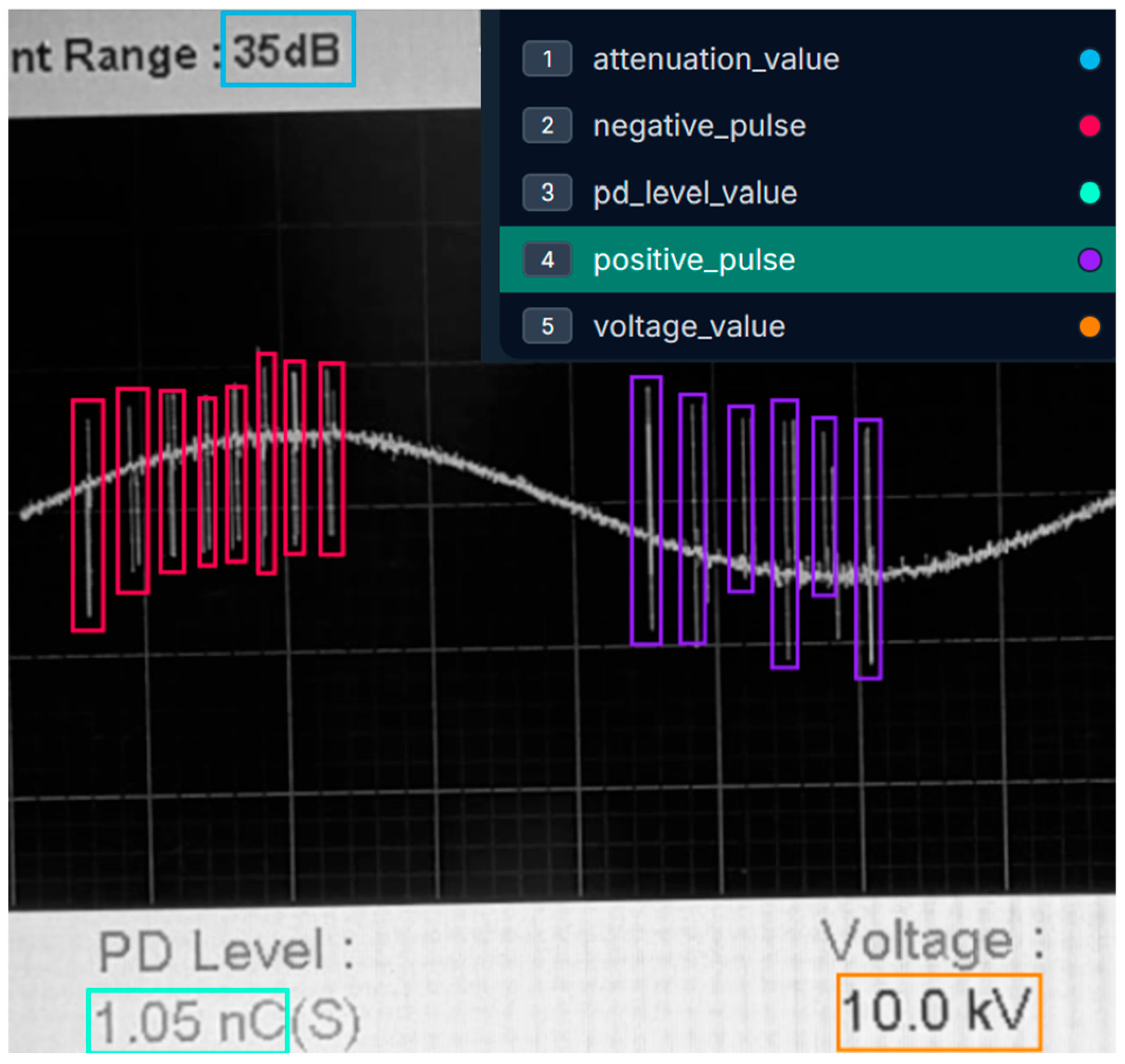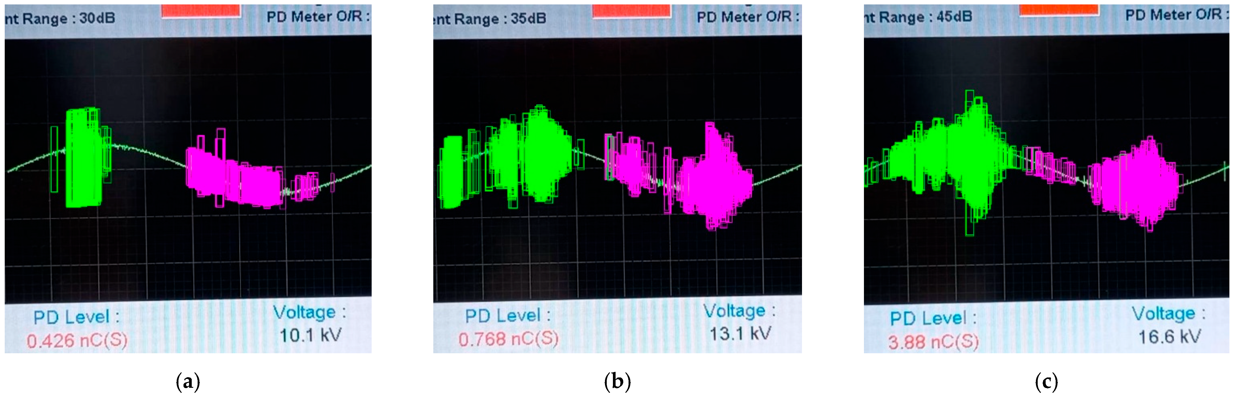 - At 10 kV, the model detects moderate discharge activity, with well-defined but relatively compact green clusters of negative and magenta positive pulses. This corresponds to an instrumental reading of PD Level 0.426 nC and Voltage 10.1 kV in Figure 17a.