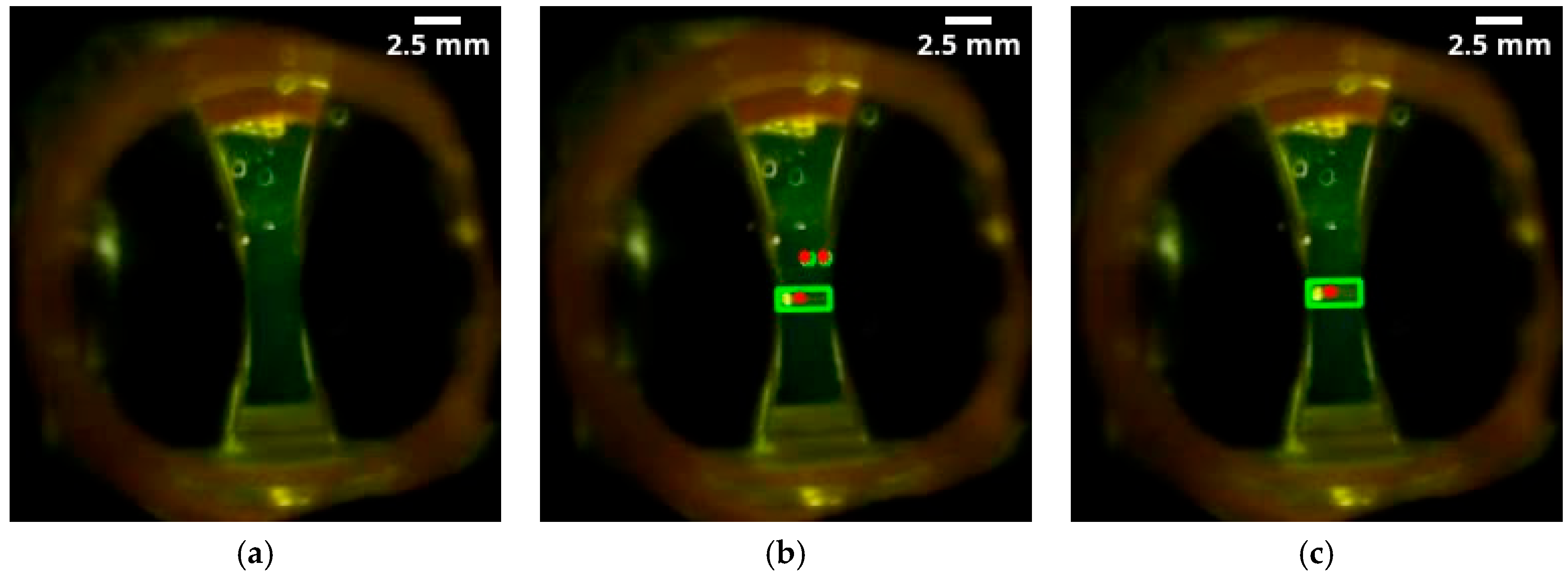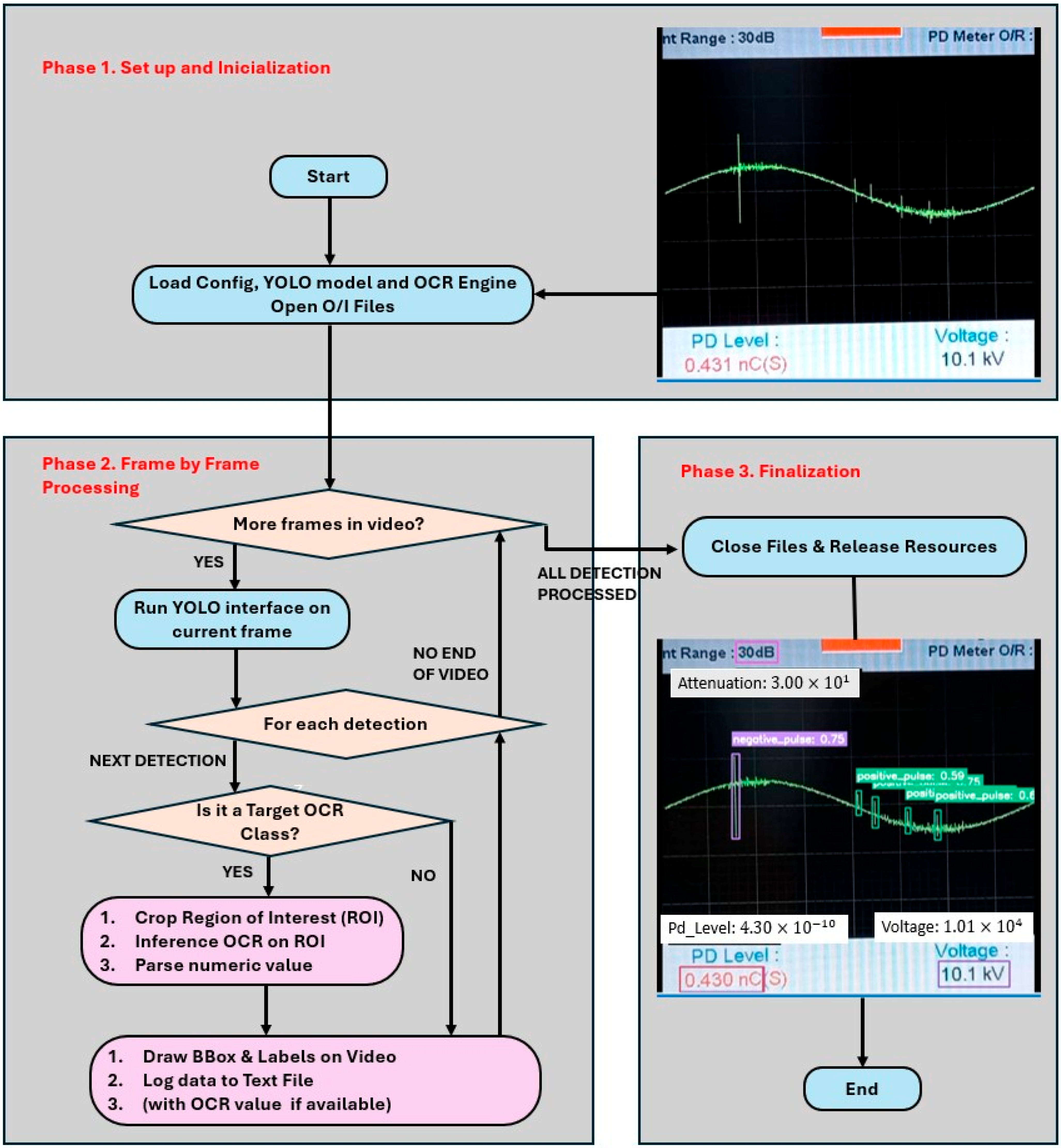 - Temporary storage: if a frame contains at least one PD that has passed all filters, the script saves the original image of that frame along with the coordinates of the bounding boxes (see Figure 19b,c of the valid PD).
