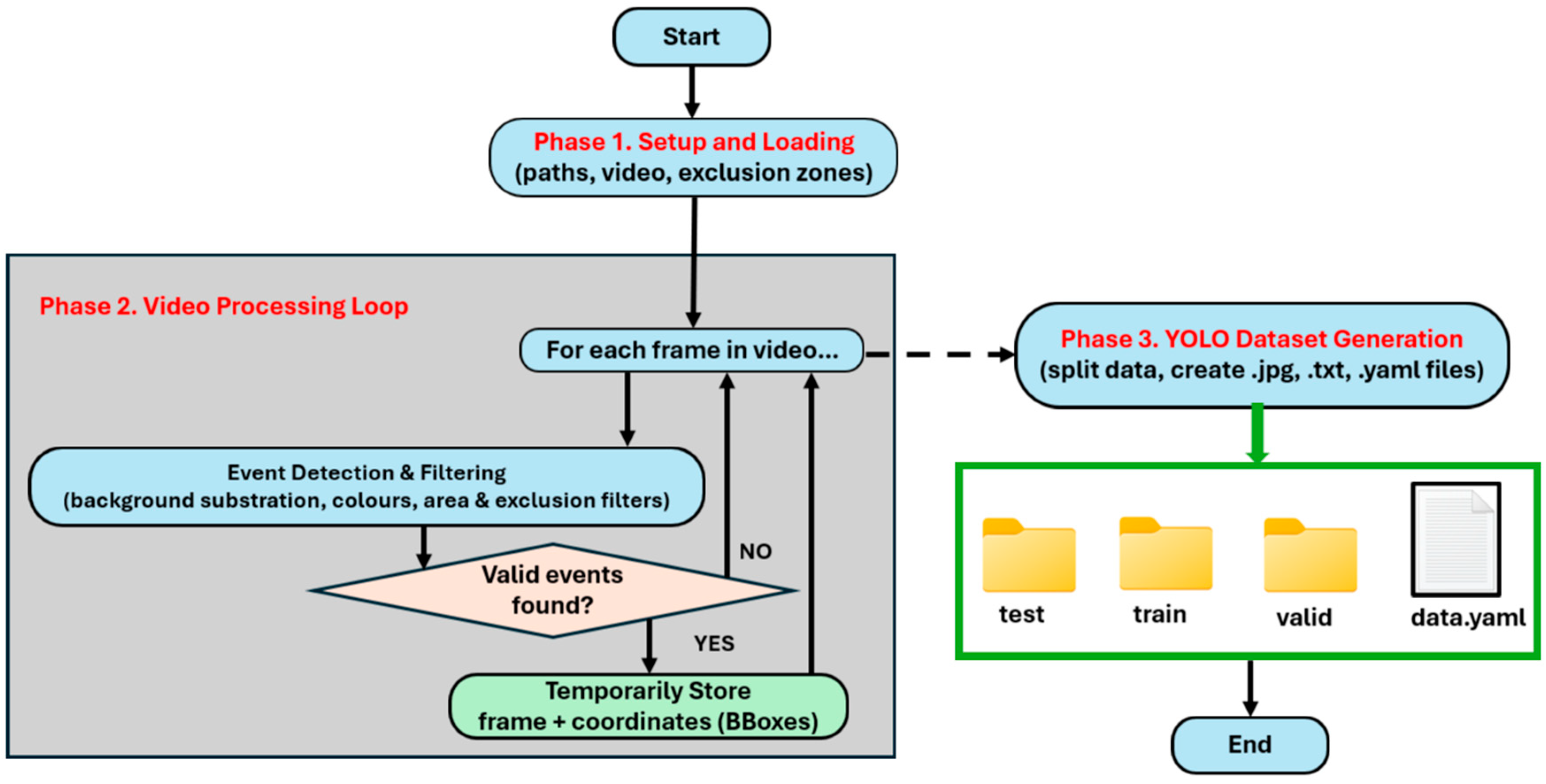 - YOLOv8 dataset generation: once the entire video has been analyzed, this final phase takes all the valid data collected and organizes it into the folder structure and file formats required by YOLOv8. This includes splitting the data into training/validation/test sets, normalizing the coordinates, and creating the .yaml configuration file.
