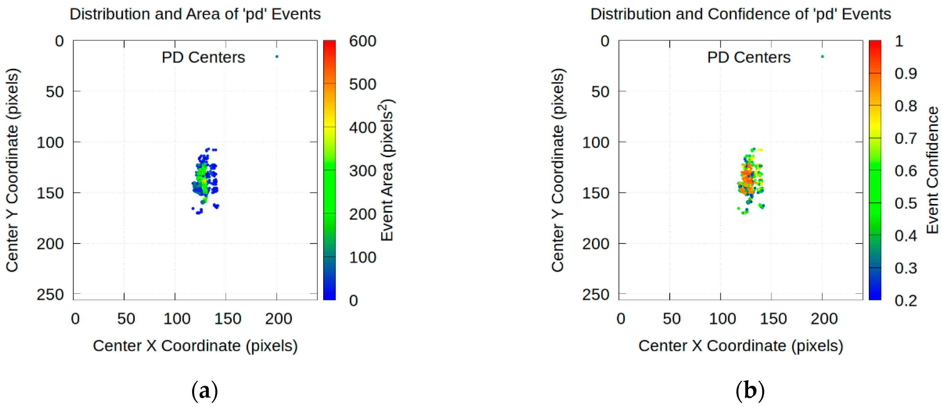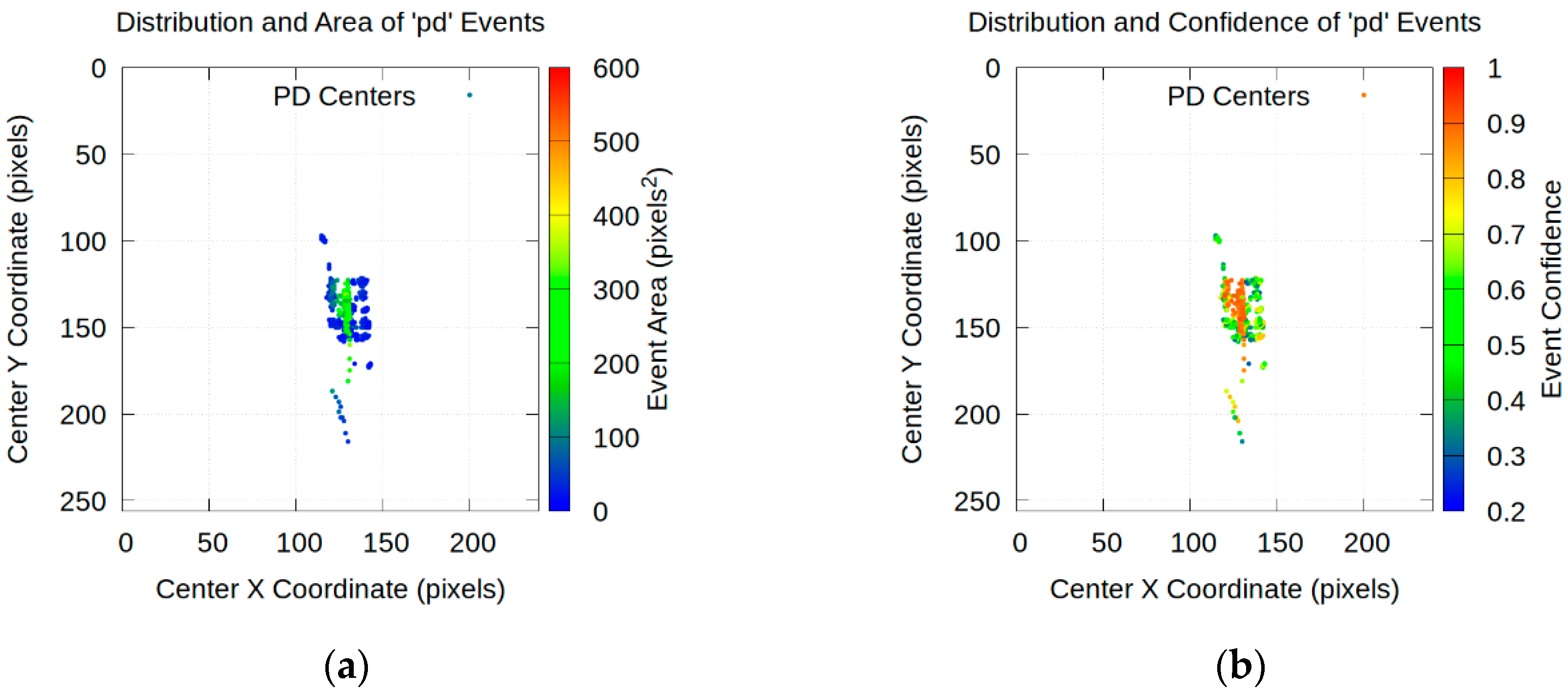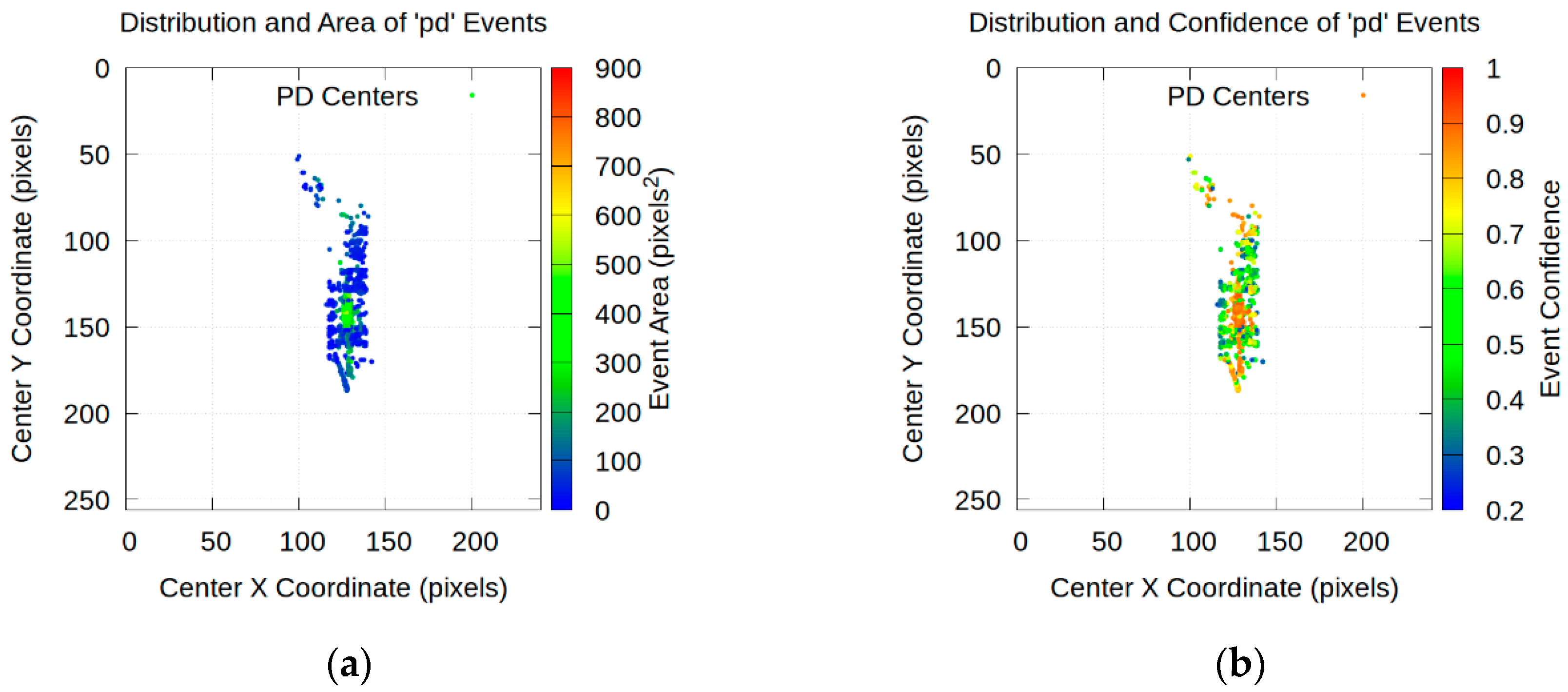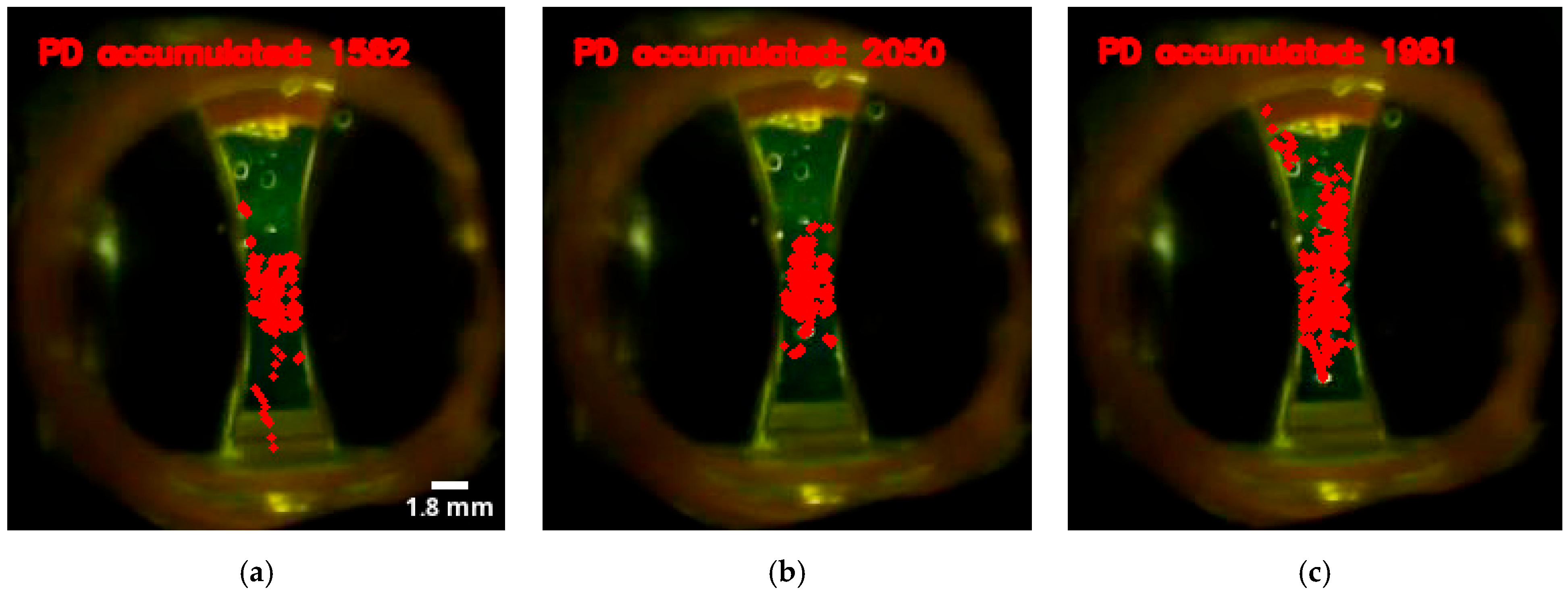 - Correlation between voltage and discharge activity: there is a clear relationship between the voltage applied to the electrodes and the number of detected PDs. At 10 kV, 1582 PDs were accumulated (Figure 23a). As the voltage is increased to 13 kV, the activity increases significantly, recording 2050 PDs (Figure 23b). However, at 16 kV, the total number of detected PD drops slightly to 1981 (Figure 23c). A reasonable hypothesis for this small decrease is that at higher energies the PDs are larger and may merge, being detected by the model as a single PD with a larger area instead of multiple smaller PDs.