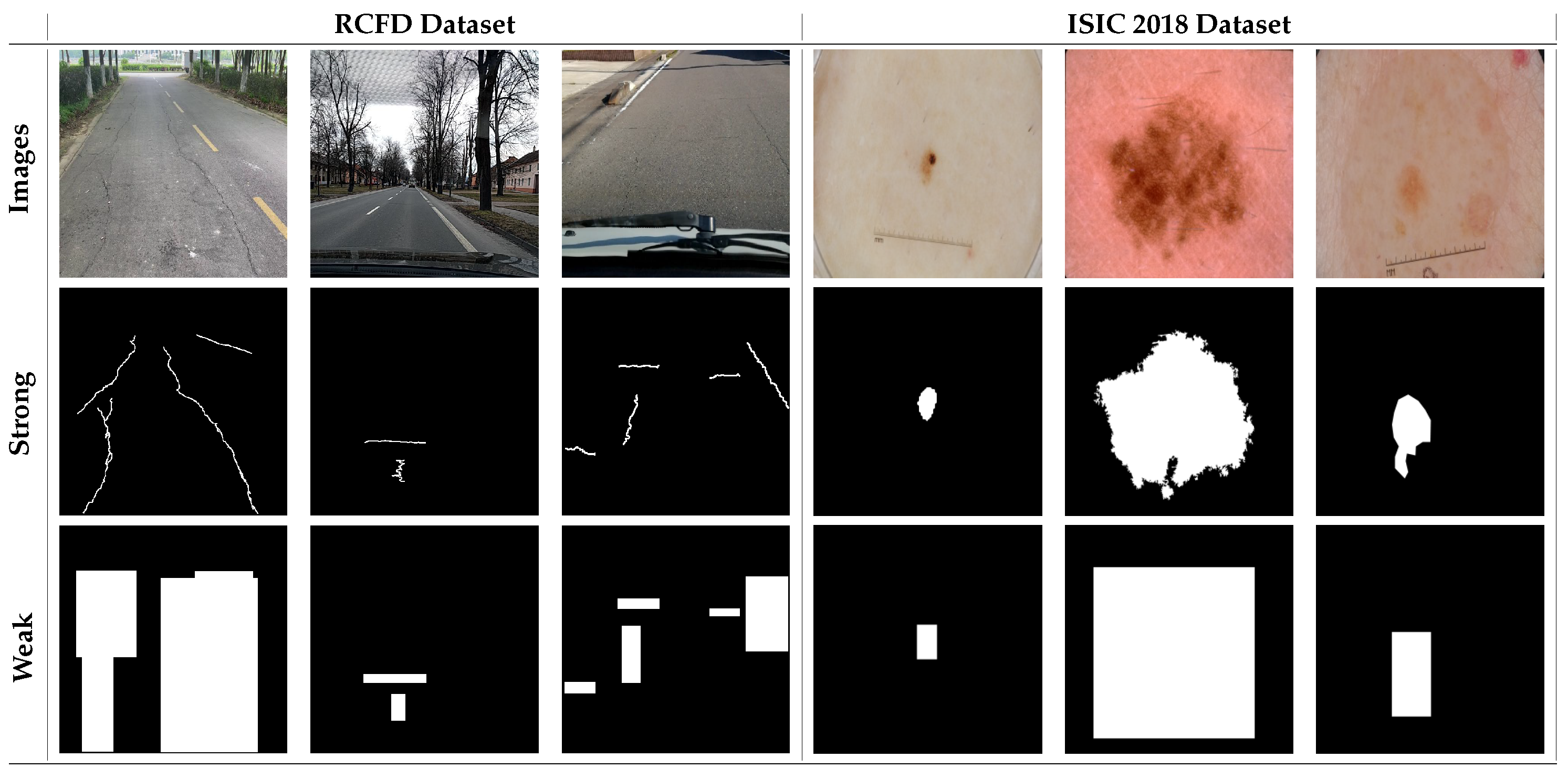 This section presents a comprehensive evaluation of the proposed framework from two perspectives: (i) an ablation study assessing the contribution of each architectural component and the impact of varying proportions of weak and strong annotations, and (ii) a comparative analysis against state-of-the-art segmentation methods. Experiments are conducted on both crack detection (RCFD dataset) and skin lesion segmentation (ISIC 2018) datasets, enabling performance assessment under different annotation budgets and across structurally distinct domains.