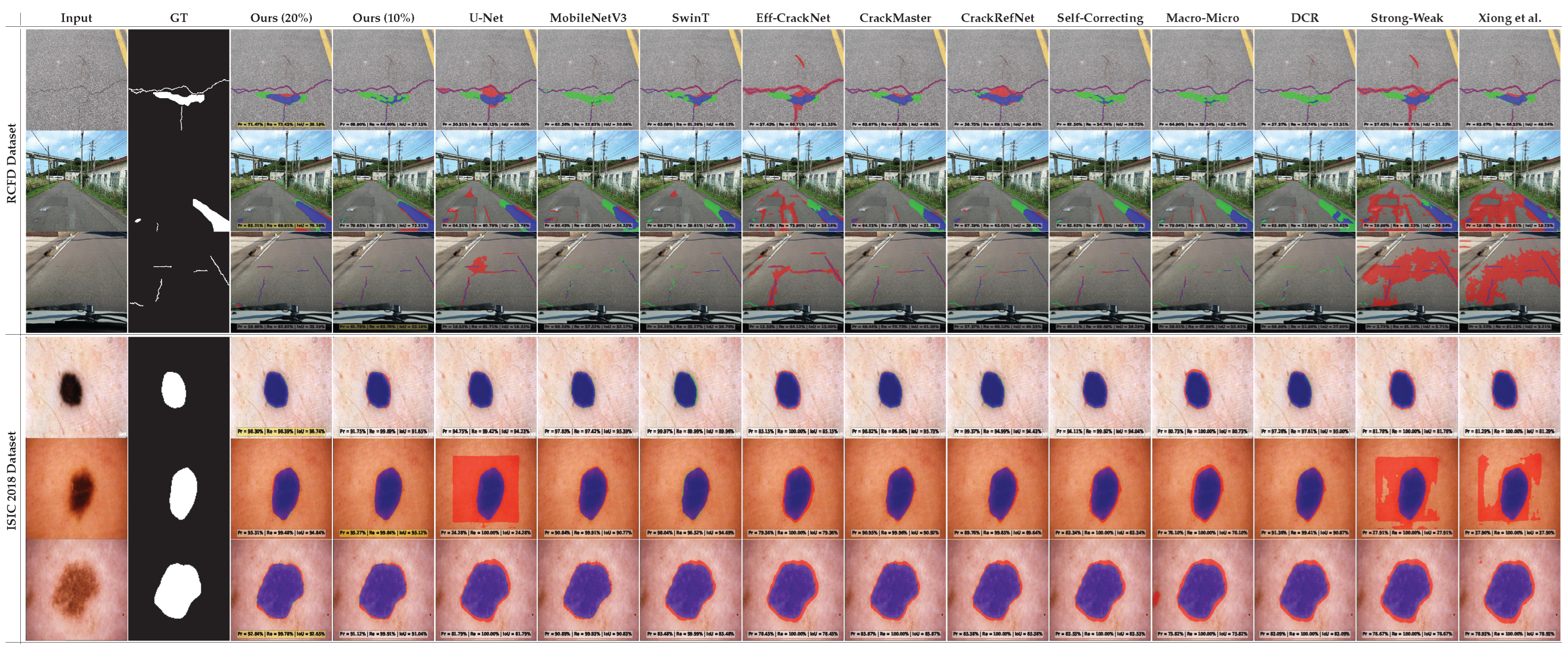 39], which tend to generate noisy or fragmented masks. Even under limited supervision (10% strong), our framework captures fine crack structures and suppresses background noise more effectively than fully supervised models such as U-Net [