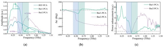 The spectra analyzation of the Bar1-PCA and the Bar2-PCA. (a) Measured amplitude spectra of the Bar1-PCA and the Bar2-PCA and the REF-PCA. (b) The phase difference (Δφ) between the REF-PCA and the meta-atom-loaded PCAs. (c) Terahertz power enhancement factors of the Bar1-PCA and the Bar2-PCA, respectively.