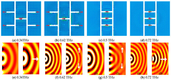 To further analyze the resonance characteristics observed in the amplitude and phase spectra of Bar1-PCA and Bar2-PCA, we investigated their electric field distributions under different modes. Using the time-domain solver of CST Microwave Studio, electric field distributions of Bar1-PCA and Bar2-PCA in CTL mode (xoy plane) and far-field radiation mode (yoz plane) were simulated by setting up electric field monitors, as shown in Figure 3. In the case of the REF-PCA, THz waves radiated in the backward direction propagate within the substrate in the form of spherical waves (Figure 3(e1)–(h1)). However, the introduction of meta-atoms induces interference and superposition between the scattered waves from the Bars and the THz waves radiated by the antenna gap, thereby altering the original radiation intensity distribution of the THz waves: For Bar1-PCA, the phase at the antenna gap matches that of Bar1 at 0.34 THz (Figure 3a). Furthermore, THz waves at 0.34 THz propagate primarily along the z-axis with significantly enhanced amplitude compared to the REF-PCA (Figure 3(e2)). Combining these results, constructive interference between scattered and radiated fields at 0.34 THz is confirmed, leading to amplitude enhancement without distinct phase features. Conversely, the phase of 0.62 THz in the antenna gap is inverted to the Bars’ (Figure 3b), and simulated far-field radiation shows divergent propagation with reduced intensity compared to the REF-PCA (Figure 3(f2)). This indicates destructive interference, causing band-stop modulation in the amplitude spectrum and an abrupt 180° phase shift. For Bar2-PCA, similar analysis yields consistent conclusions, with constructive and destructive interferences occurring at 0.72 THz and 0.5 THz, respectively, leading to amplitude enhancement and attenuation. Notably, significant phase abruptions are observed exclusively in the destructive interference band.