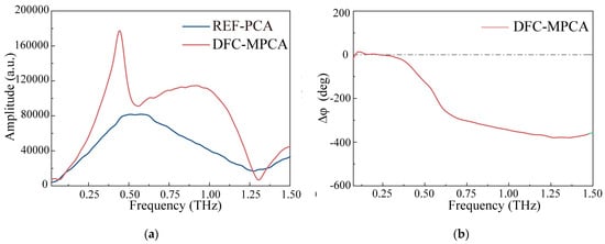 Simulation results of DFC-MPCA’s radiation properties. (a) The amplitude spectra of the REF-PCA and DFC-MPCA. (b) The phase difference (Δφ) between the REF-PCA and DFC-MPCA.
