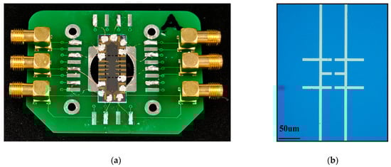To validate the design methodology and performance of the DFC-MPCA, a prototype is fabricated using micro-nano fabrication technology as shown in Figure 6. The emitter fabrication process commences with optical lithography patterning of the antenna and bias lines, followed by sequential deposition of Cr/Au (10/200 nm) thin films and a standard lift-off procedure. Comparative measurements of the same pair of antennas with and without microstructures cannot be conducted in the experiment. Thus, six pairs of antennas were fabricated on each sample. Among these, two pairs are unstructured conventional antennas, which serve as the reference group. Finally, the sample is packaged on a PCB, and the voltage is applied through the SMA connectors. It should be mentioned that the meta-atoms are not only coplanar with the dipole antennas but also consistent in dimension and material. Therefore, their fabrication process is similar to that of conventional PCAs, which significantly reduces the manufacturing difficulty. In short, the manufacturing of the proposed PCA based on meta-atomic electrode is relatively easier than that of the reported ones [8,9,10,11].
