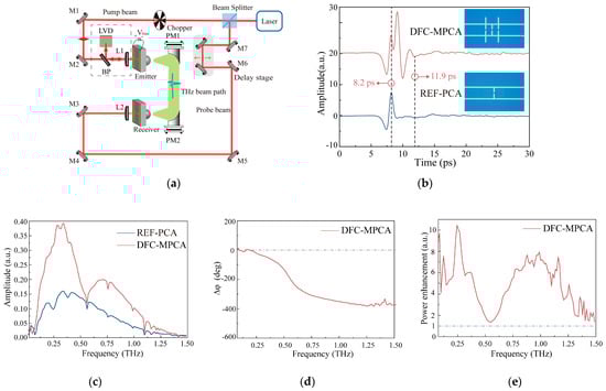 Experimental characterization results. (a) Schematic diagram of the 4F THz time-domain spectroscopy-based characterization system and the added reflective imaging system (shown in the dashed box). BP: beam splitter, M: mirror, PM: parabolic mirror, L: lens. (b) Time-domain pulse waveforms. The inset shows the optical microscope image of the corresponding sample. (c) Terahertz amplitude spectra. (d) The phase difference (Δφ). (e) Power enhancement factor of DFC-MPCA.