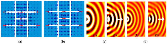 To further analyze the dual-frequency complementary characteristics of the DFC-MPCA, we investigated the electric field distributions, as illustrated in Figure 8. At 0.5 THz, the phase at the antenna gap is consistent with Bar1’s but inverted compared to that of Bar2 (Figure 8a). Furthermore, 0.5 THz waves propagate primarily along the z-axis, with significantly enhanced amplitude compared to the REF-PCA (Figure 8c(2)). Combining these results, although destructive interference was observed between scattered and radiated fields of Bar2, constructive interference exists between the scattered and radiated fields of Bar1. The complementary modulation of these two scattered fields ultimately results in amplitude enhancement without distinct phase features. For the 0.62 THz wave, similar analysis yields consistent conclusions.
