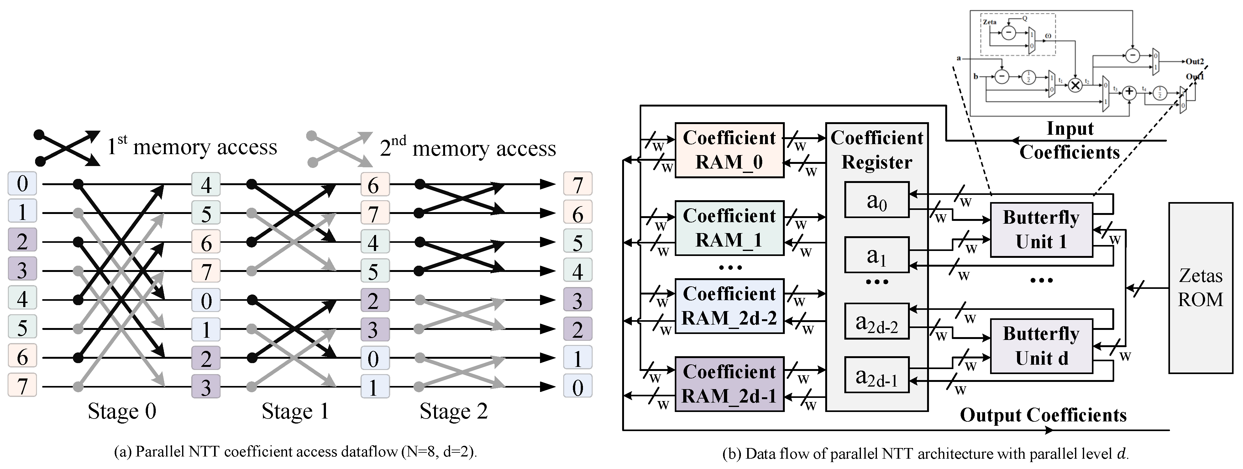 The NTT is a variant of the discrete Fourier transform (DFT) adapted for operations over finite fields. It effectively executes convolutions, a key process in polynomial multiplication, as well as various cryptographic algorithms. In an n-point NTT, n input polynomial coefficients are transformed into for . Here, the n-th root of unity, , meets the condition , and for any , . The inverse NTT (INTT) reconstructs the original polynomial from its transformed version using the formula , thereby guaranteeing the unique recovery of the coefficients.