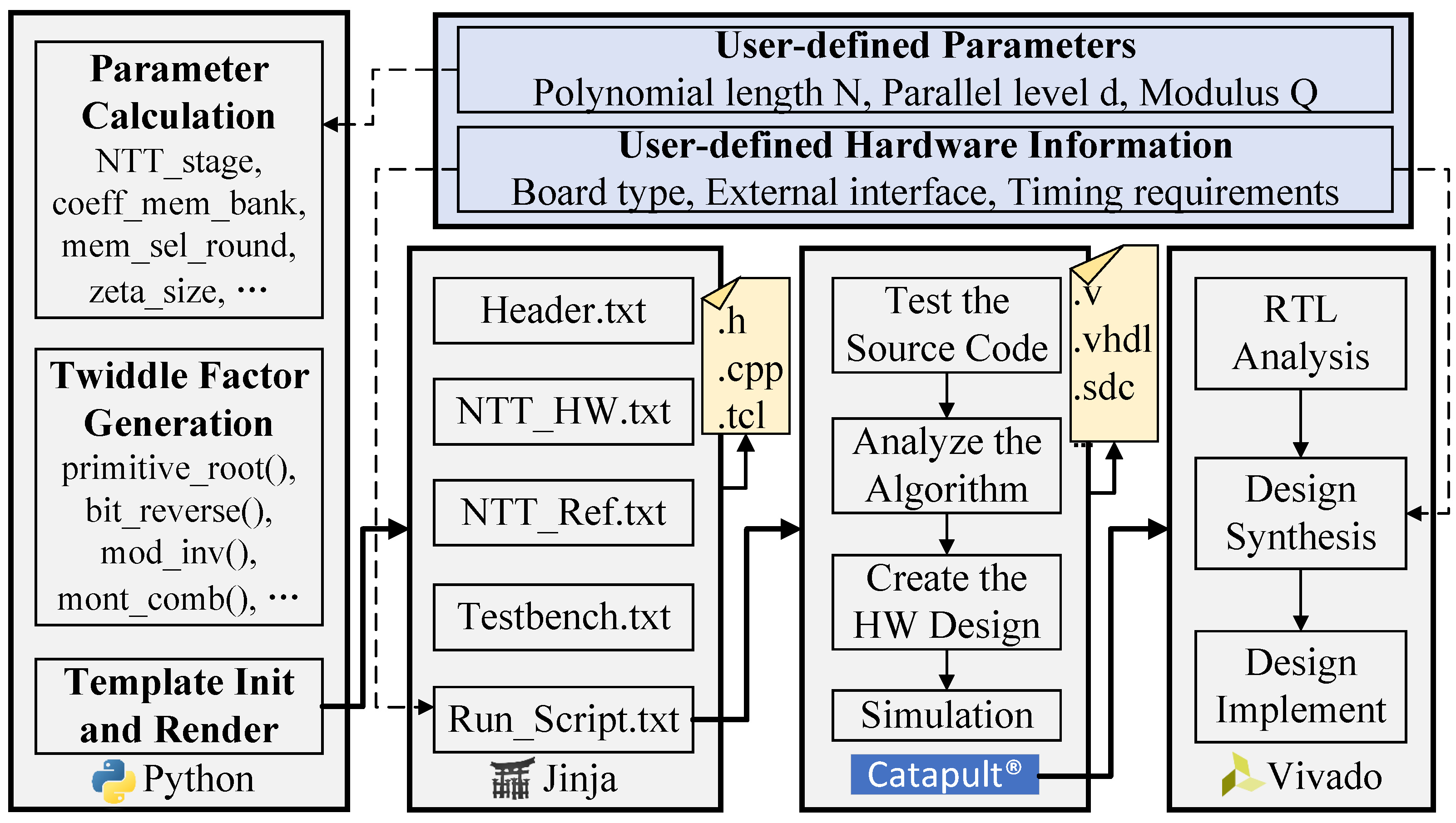 8] focused on access conflicts, proposing a rotation table to reorder tuples in-place. These works optimize NTT accelerator performance and adaptability from multiple angles. However, designs based on manual patterns and involving co-design of algorithm and architecture are complex. It presents a difficulty for non-specialists to reuse and integrate into application scenarios. This approach lacks a portable, user-friendly, automated design methodology that incorporates expert knowledge.