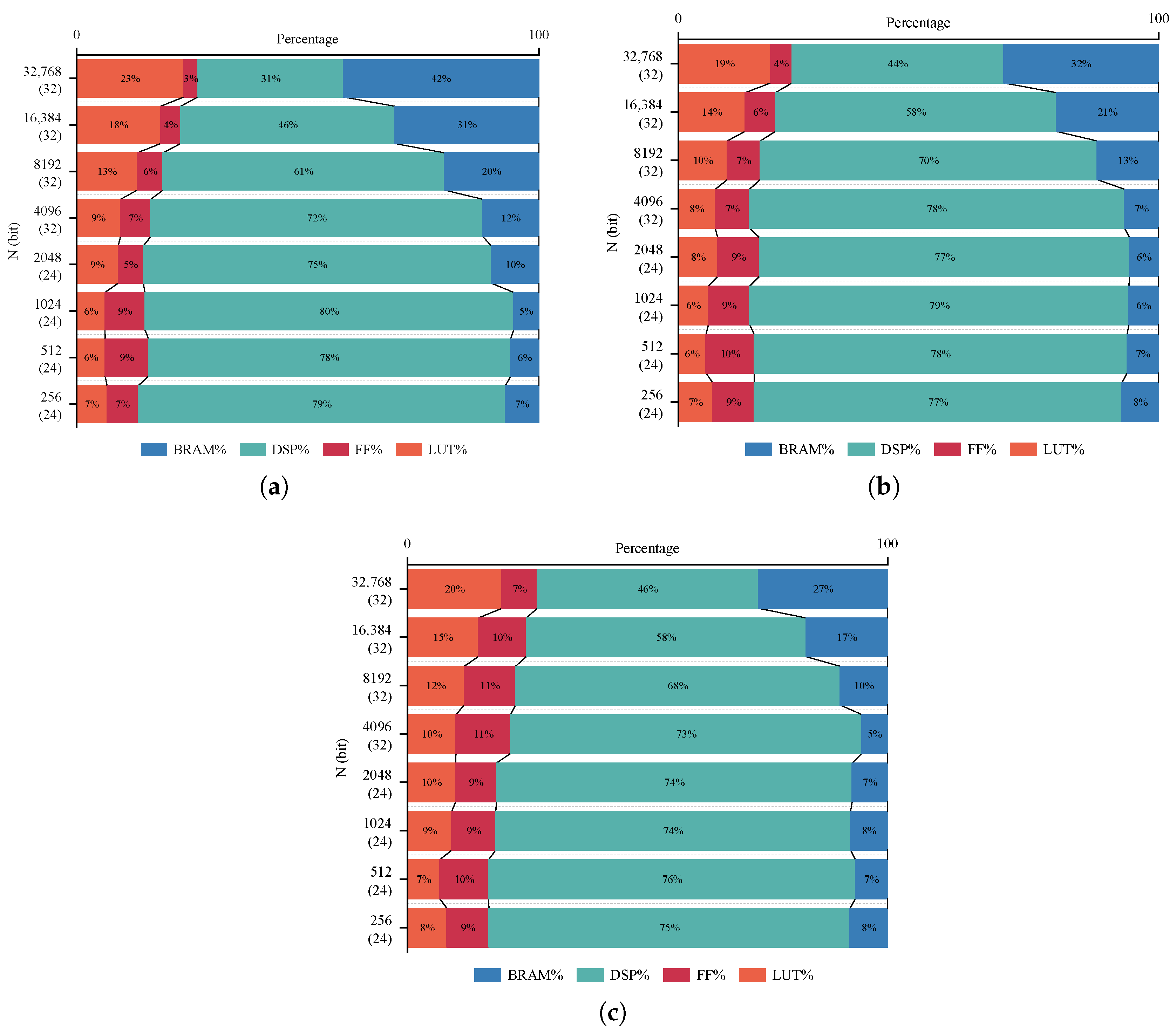 N, but a more significant factor is the implementation of the memory block. Our designs generate general Verilog code via HLS, which is not optimized for specific FPGA IPs. For memory units, the Vivado tool automatically uses a combination of BRAM and LUT to implement them, causing memory requirements to increase proportionally with