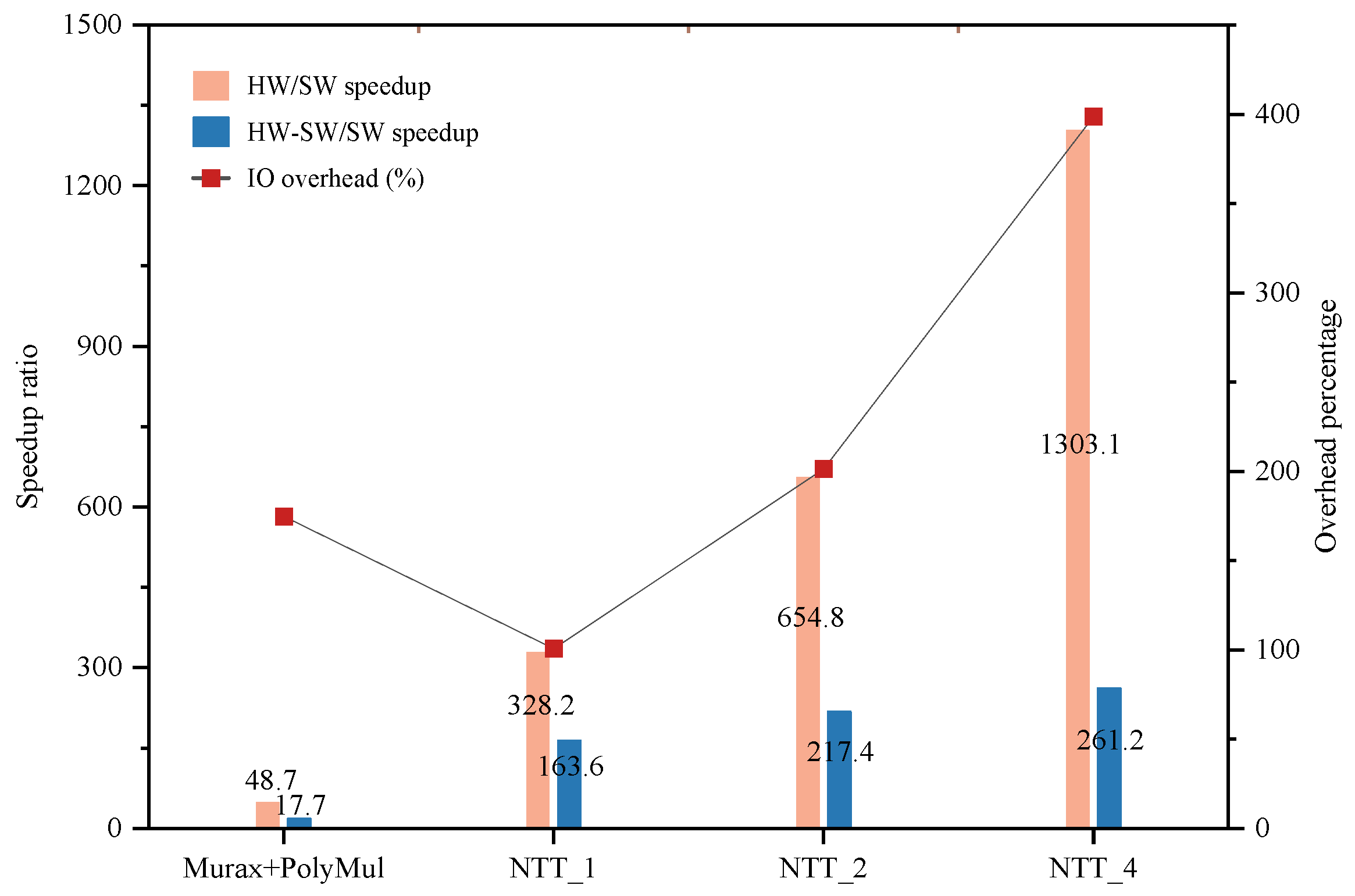 Figure 7 shows, the speed-up ratio of the two strategies, HW and SW/HW co-design, the HW approach has a 328.2 to 1303.1 times improvement, while the SW/HW co-design approach has a 163.6 to 261.2 times improvement. Comparing our SW/HW co-design with the hardware compositions of our work at different levels of parallelism, we can see that the performance improvement in the SW/HW co-design approach with increasing parallelism, while reducing the amount of code by a factor of 20, is not as significant as the average performance improvement of the HW approach, which has a speedup ratio of nearly 99.3%. In our observations of the I/O overhead depicted in the figure, we find that as the number of butterfly units increases, the enhanced parallelism leads to an exponential improvement in the computation speed of the hardware (HW) approach. However, in the software-hardware co-design strategy, the involvement of the processor in scheduling and I/O operations becomes a bottleneck that constrains overall performance. As shown in
