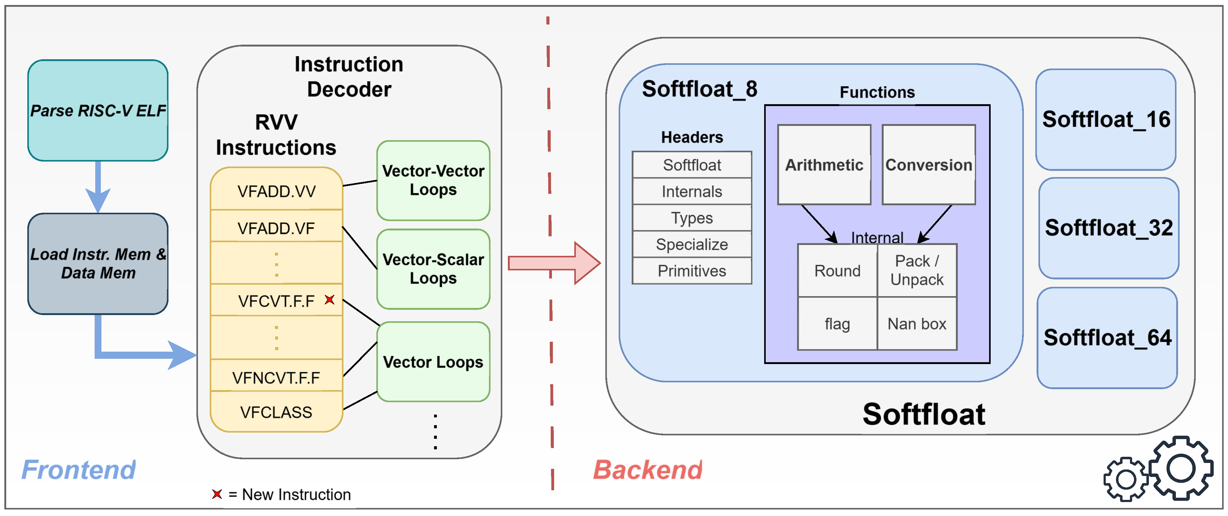 We extend Spike with FP8 support by introducing a new SoftFloat back-end module (Softfloat_8) and making minimal frontend changes, including a format-selection parameter (E4M3/E5M2), small updates to the RVV FP decode/instruction files to dispatch FP8 elements, and a new instruction (vfcvt.f.f). Figure 1 summarizes the integration.