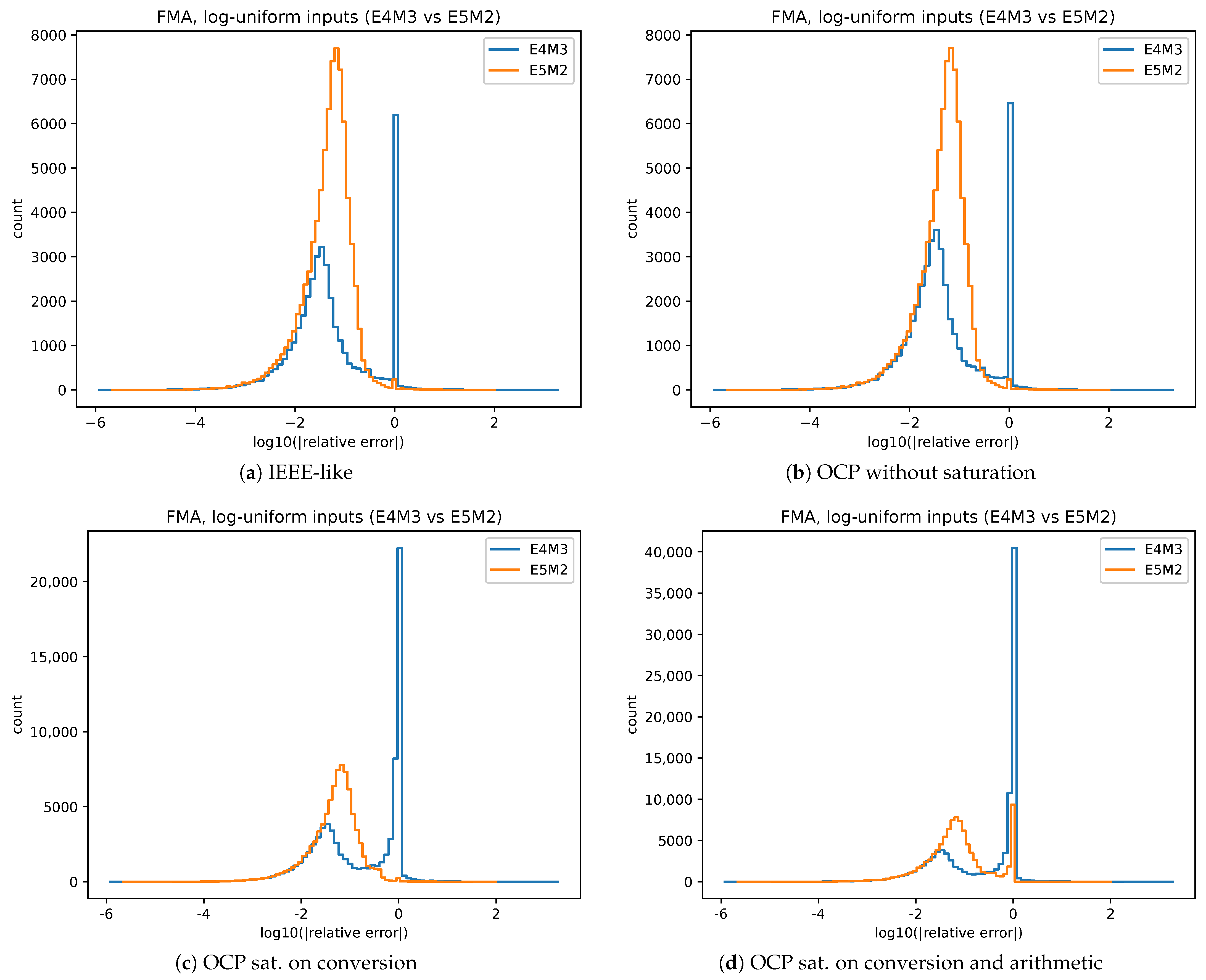 For the range-stress results (log-uniform, ± 5 decades), the standard used dominates the behaviour. Figure 2 shows the error distributions for fma using the same random seed. A prominent spike at x = 0 on the horizontal axis (i.e., log 10 | rel _ err | = 0 | rel _ err | = 1 ) is expected for the E4M3 curve. It arises from trials in which FP8 quantization—either at operand conversion or due to underflow after the operation—produces an output equal to zero, while the FP32 reference is non-zero. By definition this yields | rel _ err | = 1 , which appears at x = 0 in the logarithmic plot. The effect is more pronounced for E4M3 because its exponent range is narrower than E5M2. Consistent with this, Table 6 shows that under IEEE-like, E4M3 exhibits 15 % NaN and 47 % Inf (median | rel _ err | = 0.037 ), whereas E5M2 has negligible NaN and 17.4% Inf (median 0.053); OCP (no saturation) removes Inf for E4M3 but yields 58 % NaN (median 0.036); adding saturation on conversion reduces non-finites (E4M3 23 % NaN, 0% Inf) at the cost of higher finite error (median 0.35 ); and saturation on operations and conversion eliminates non-finites entirely (0%/0%) but further increases bias (medians 0.85 for E4M3 and 0.065 for E5M2, with P95 near 1).