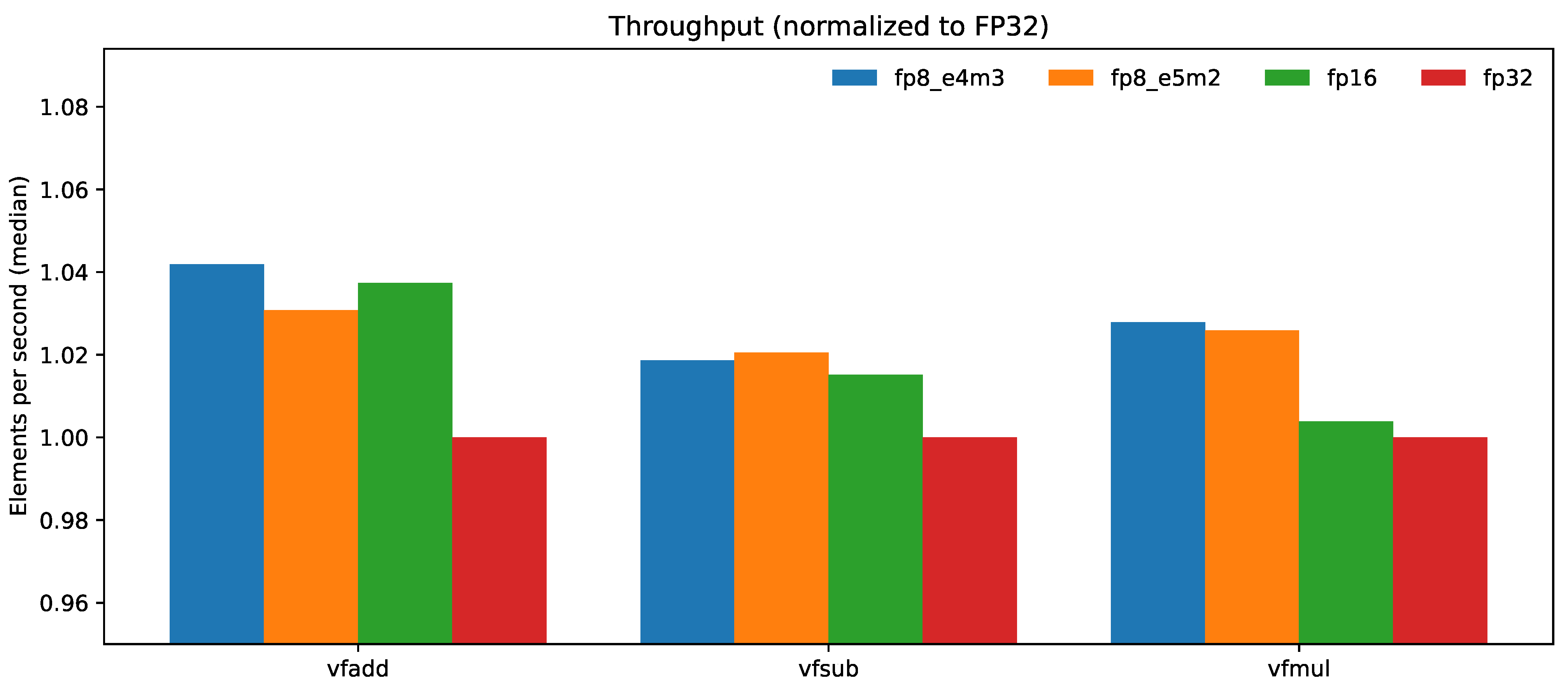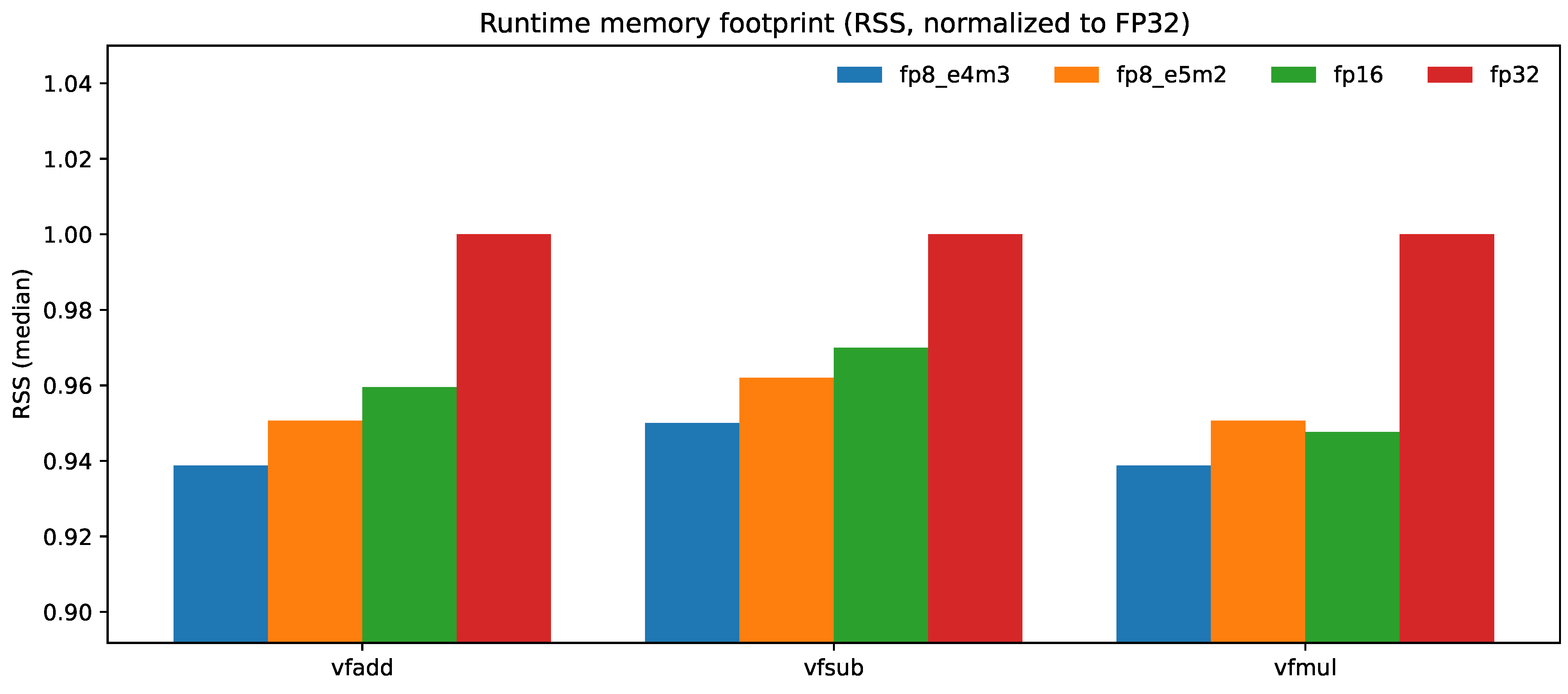 • Host-time characterization and binary-size impact: Under identical VLEN, we quantify median elements per second and runtime memory footprint (RSS) on vfadd/vfsub/vfmul. FP8 delivers +2–4% more elements per second than FP32 with ≈5% lower RSS; E4M3 ≈ E5M2 in throughput. Enabling FP8 in Spike increases the distribution footprint in the stripped executable by ~1.8% (mostly .text).