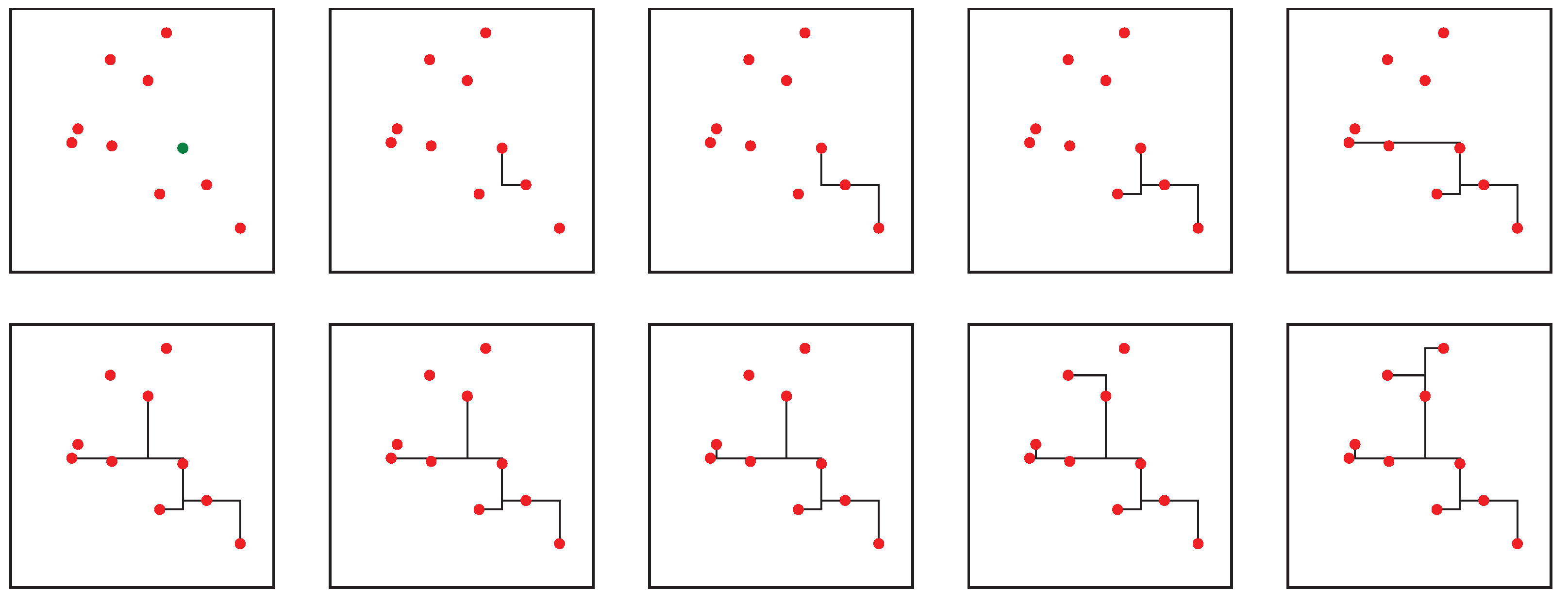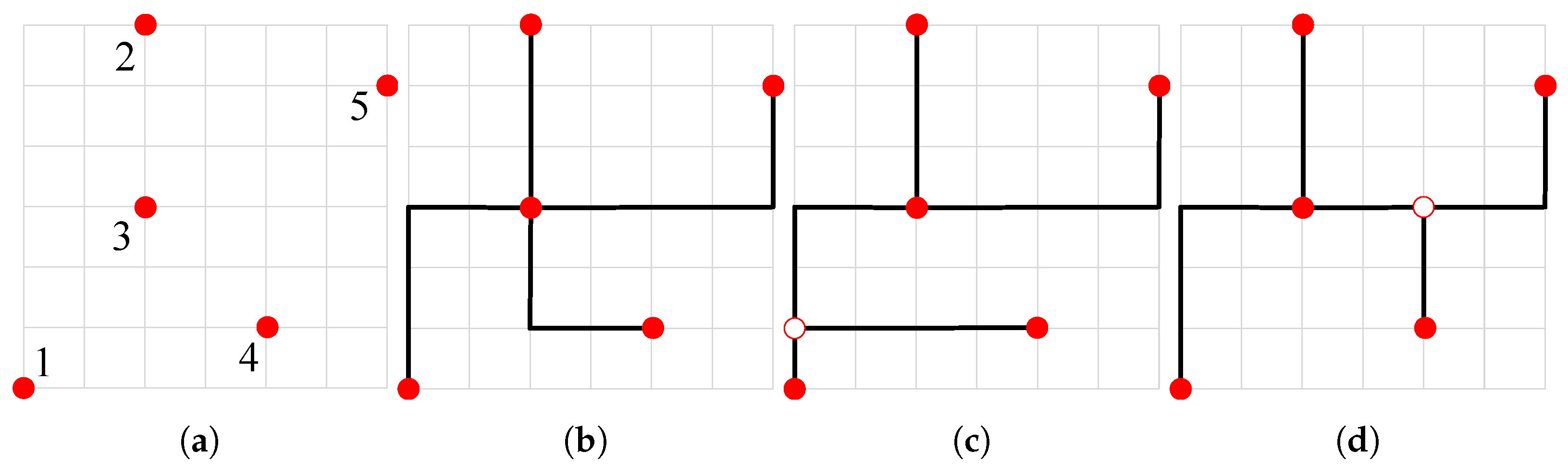 Figure 1c,d, these additional nodes, called Steiner points (white circles), act as junctions that enable interconnect segments to merge, thereby shortening the total wirelength compared with the MST.