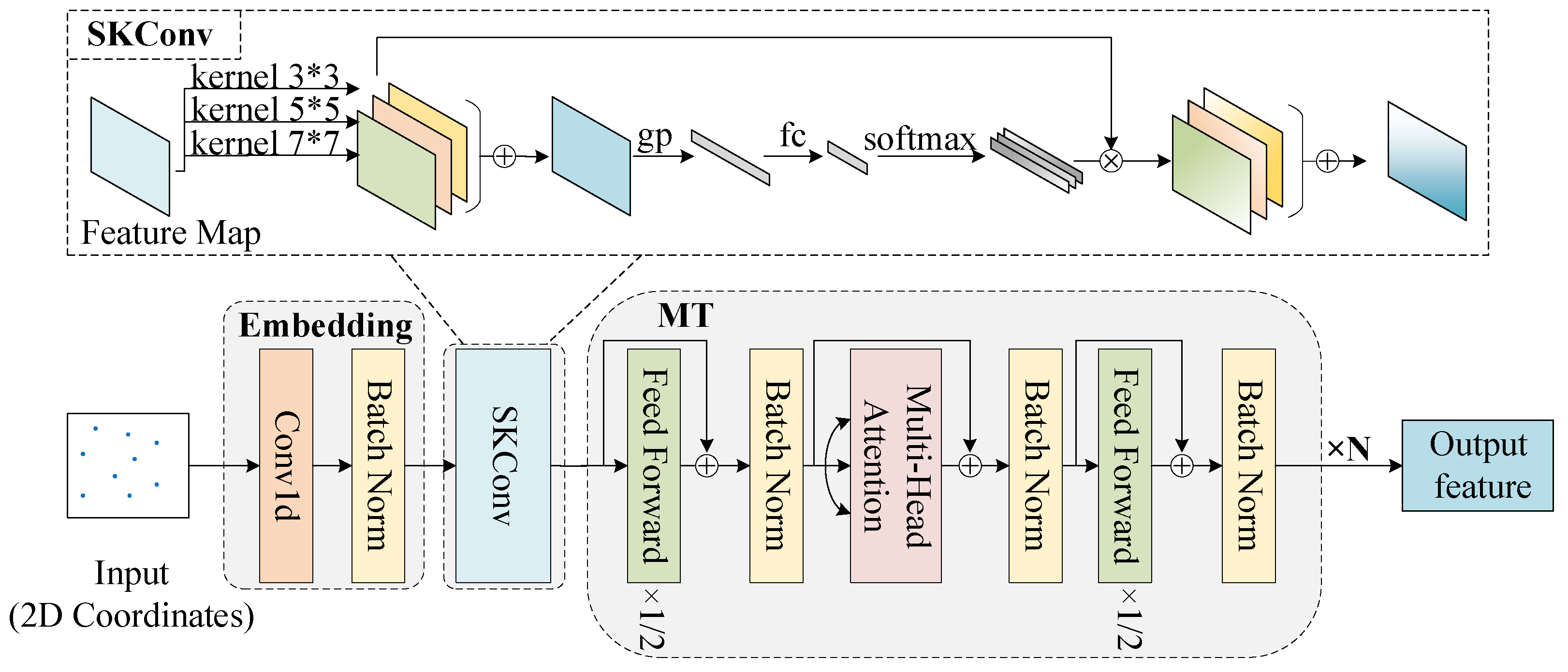 To address this, the proposed encoder adopts a hybrid structure that combines an SKConv and an improved Macaron Transformer. SKConv enhances local feature representation by dynamically adjusting its receptive field across multiple kernel sizes, allowing the model to extract multi-scale geometric patterns from irregular point sets. This is particularly important for RSMT, where topological relations can vary significantly with terminal configuration.