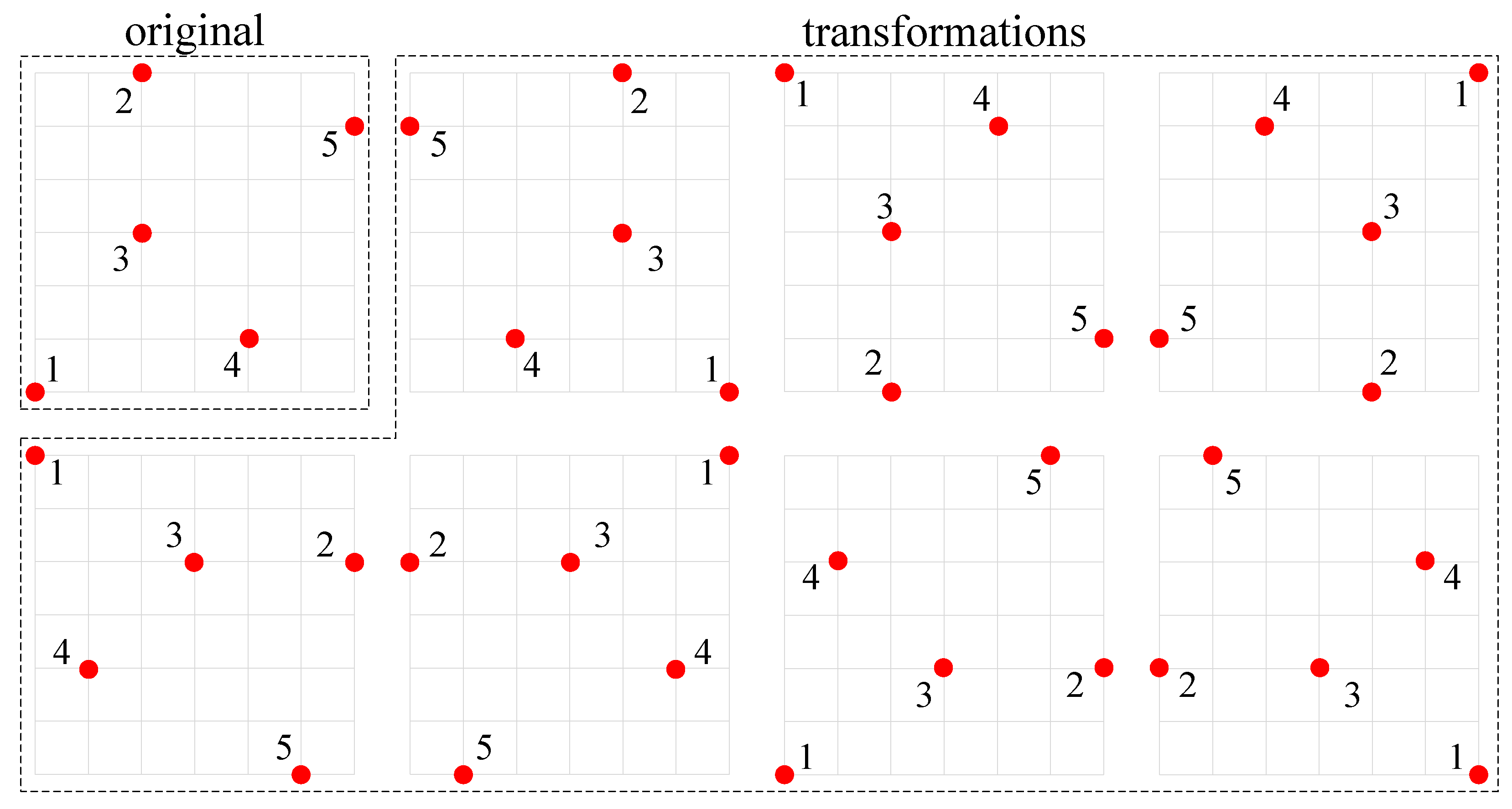 To further enhance prediction accuracy, an eight-way transformation strategy is applied to each test case. Specifically, each input point set is subjected to eight geometric transformations, including horizontal/vertical reflections and coordinate swaps, to simulate the common symmetries in physical layout designs, as illustrated in