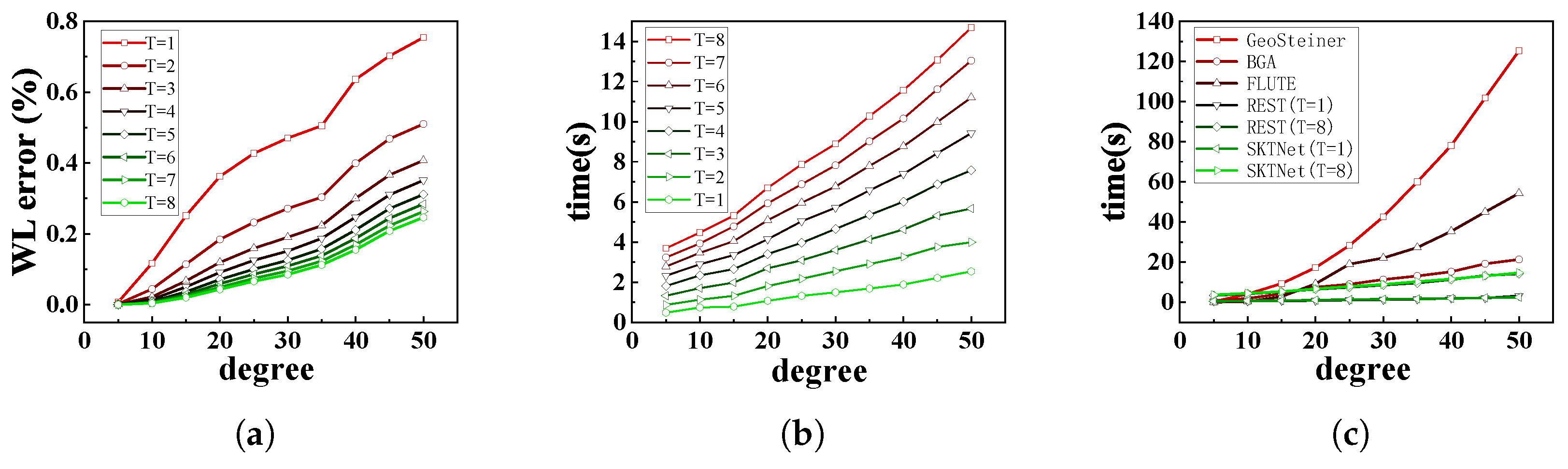 Table 2 presents the wirelength error of the proposed SKTNet compared with REST and heuristic baselines across various degrees, under both single-input (T = 1) and eight-way transformation (T = 8) settings. SKTNet (T = 1) directly evaluates raw inputs and already achieves lower errors than REST (T = 1), demonstrating the robustness of its feature extraction and dependency modeling. With SKTNet (T = 8), the model further reduces wirelength error by selecting the best result among the eight transformed variants, effectively functioning as a test-time ensemble. This strategy yields consistently lower error, especially in larger instances, though at the cost of increased runtime as reported in