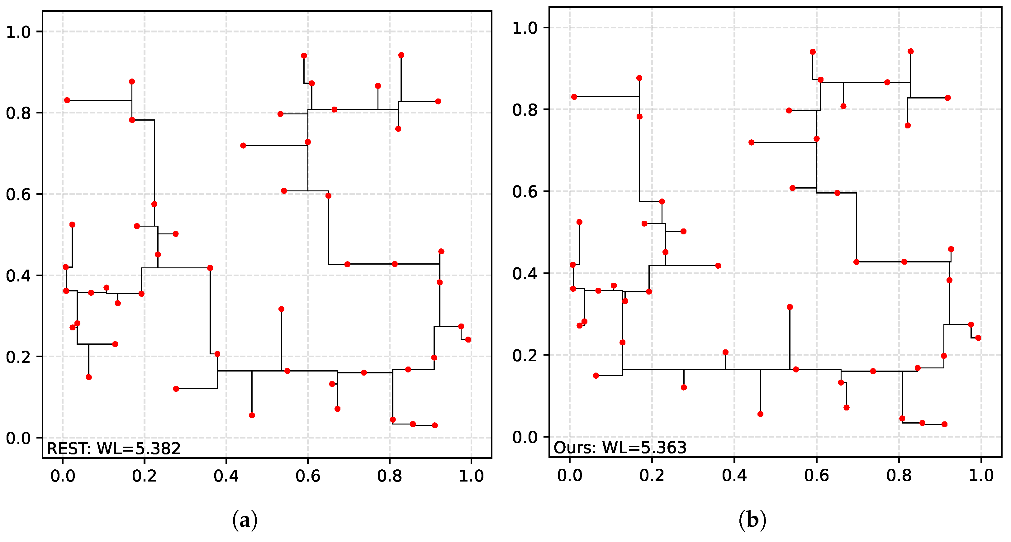 Figure 6b shows the result generated by the proposed model, which achieves a more efficient structure by reducing redundant wire segments and avoiding excessive detours. This leads to shorter overall wirelength and a topology with fewer crossings, making the layout more regular and closer to the optimal RSMT. The improvement is primarily attributed to the SKTNet encoder’s ability to capture multi-scale geometric features and global structural relationships among the input terminals. Additionally, the integration of the SCST strategy stabilizes the learning process and promotes better solution quality through policy refinement during training.