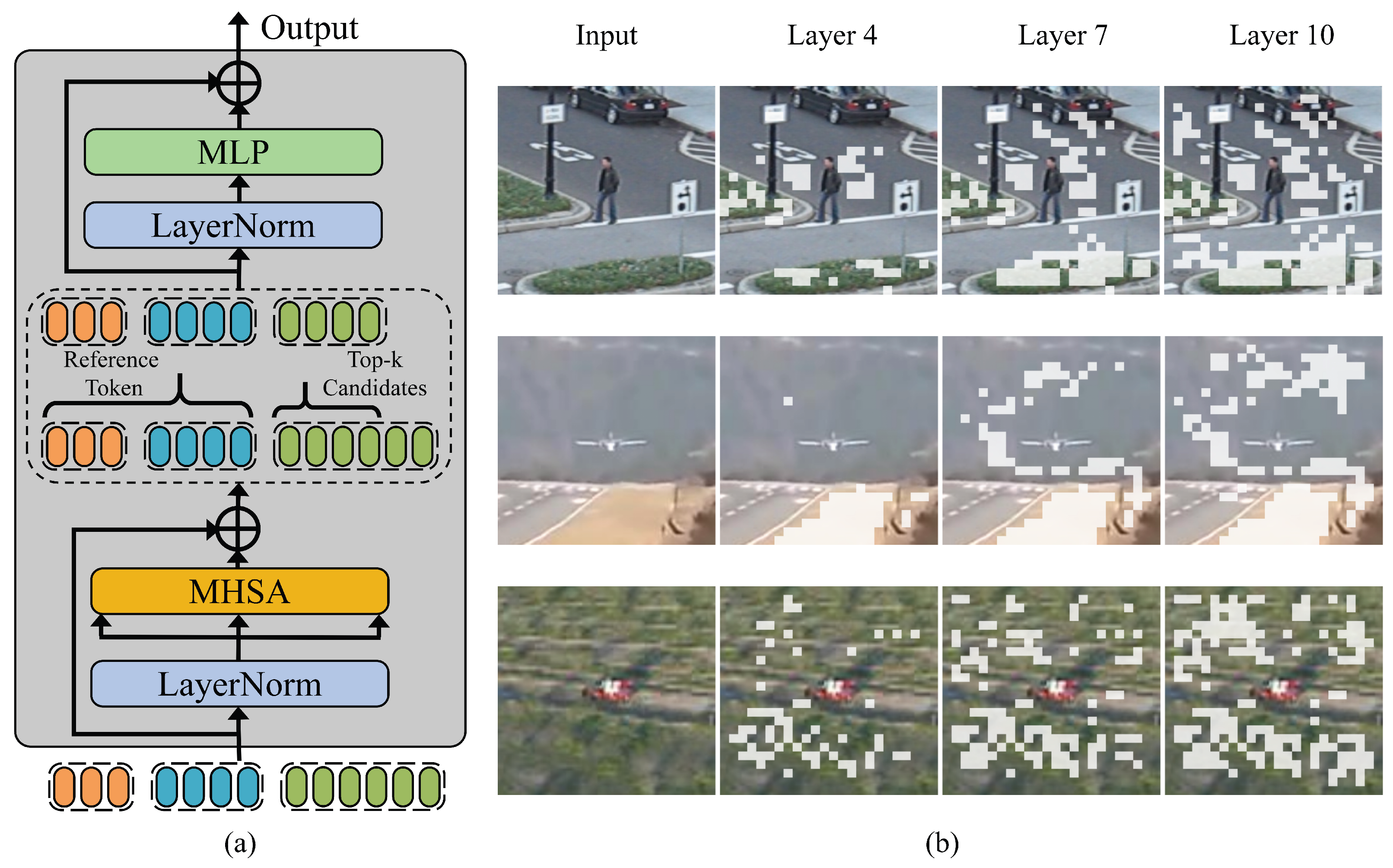 (a) The structure of the Semantics-Guided Token Filtering module: (b) Visualization of the search tokens selection. The white regions denote the discarded tokens. After token selection in the 4th, 7th, and 11th layers, some tokens containing background information are gradually discarded, and the target tokens are retained.