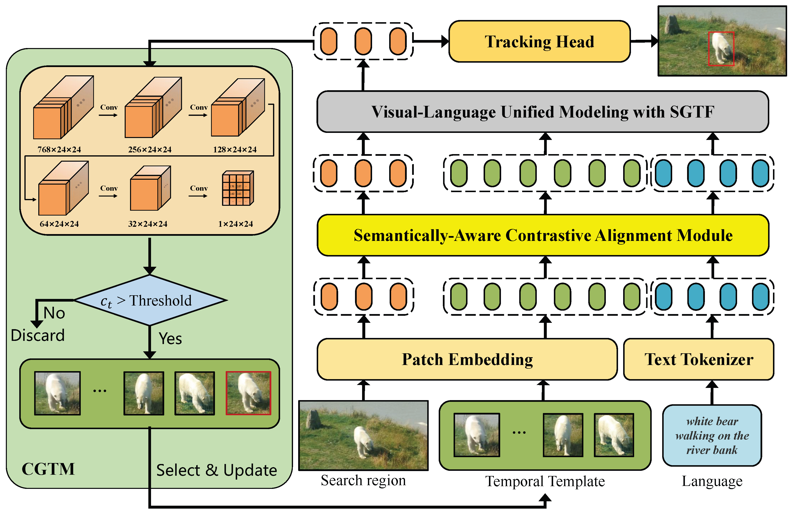 31] constructs inter-frame instance-level feature relations and extracts target-specific tokens, effectively reducing redundancy while improving temporal consistency. In this paper, we aim to develop a visual–language tracker that dynamically maintains a high-quality sample pool and temporal template set, enabling adaptive modeling of target appearance evolution across time.