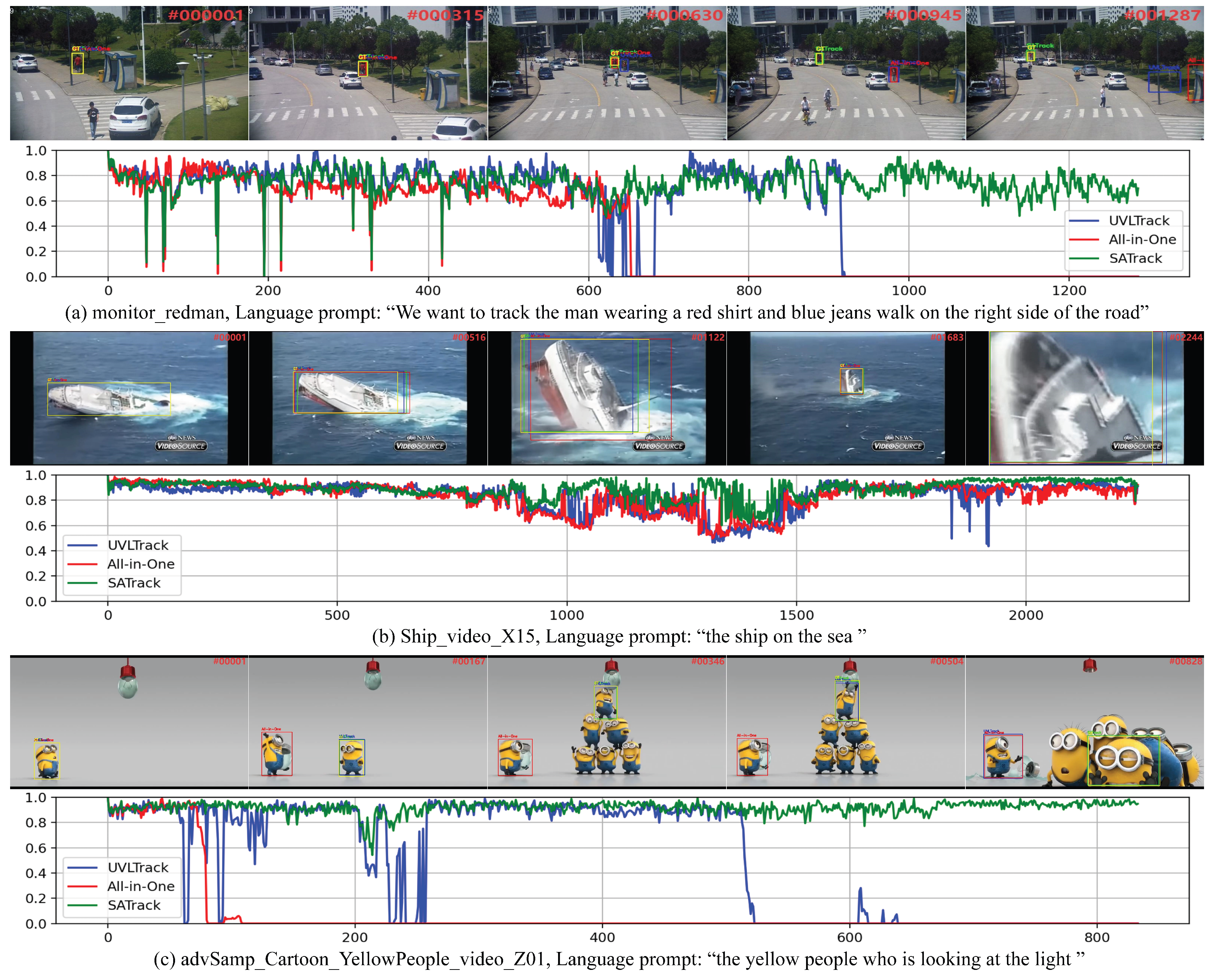 Qualitative comparison on three challenging video sequences from the TNL2K test set. The top line shows the tracked target and bounding box, the middle line shows the IoU score over time, and the bottom line presents the language prompt. SATrack demonstrates superior tracking performance, maintaining accurate localization even under challenging scenarios such as occlusions and distractors. “#” indicates the frame number of the video. Best viewed by zooming in.