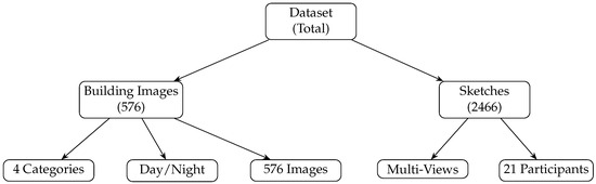 In research of localization, there is still limited exploration of semantic localization based on architectural sketches, which has resulted in a lack of publicly available datasets. To more effectively validate our model and establish reliable sketching guidelines, we constructed both a sketch dataset and a building image dataset, as illustrated in Figure 4. The building image dataset consists of 576 original building photographs, covering four categories of building groups with distinct architectural line styles. To ensure diversity and robustness, the images were captured under both daytime and nighttime conditions. As shown in Figure 5, we collected 2466 sketches corresponding to the 576 building photographs, with each image described from multiple viewing angles. All sketches were drawn by 21 participants without prior drawing experience, ensuring diverse drawing styles that closely resemble real human navigation scenarios. This comprehensive dataset design not only allows for a rigorous evaluation of our model’s robustness across varying environments but also provides a valuable resource for future research in sketch-based localization.