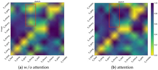 However, when observing the performance of the network with attention mechanism, its overall performance is greatly improved compared with the simplified network, especially when facing scenes with complex backgrounds or unprominent architectural textures. It improves the accuracy of MAP@3 by about 3% over the simplified network’s MAP@3 during the day, and it improves the accuracy by about 10% during the night. In addition, we also visualize the vector distance of the final match, where a smaller vector distance between the sketch and the image indicates a better match. To make the contrast more obvious, we apply post-processing in the 0–1 range, where yellow tends to 0 and purple tends to 1. As shown in Figure 11, the yellow squares are concentrated and located on the diagonal in the network with attention module, which also means that the corresponding matching is better completed. In networks without attention modules, the yellow squares are slightly scattered, resulting in poor results. Therefore, the network with attention mechanism has a strong ability to extract line information features, which ensures that the network still has good performance when the real picture highlights line information with difficulty.