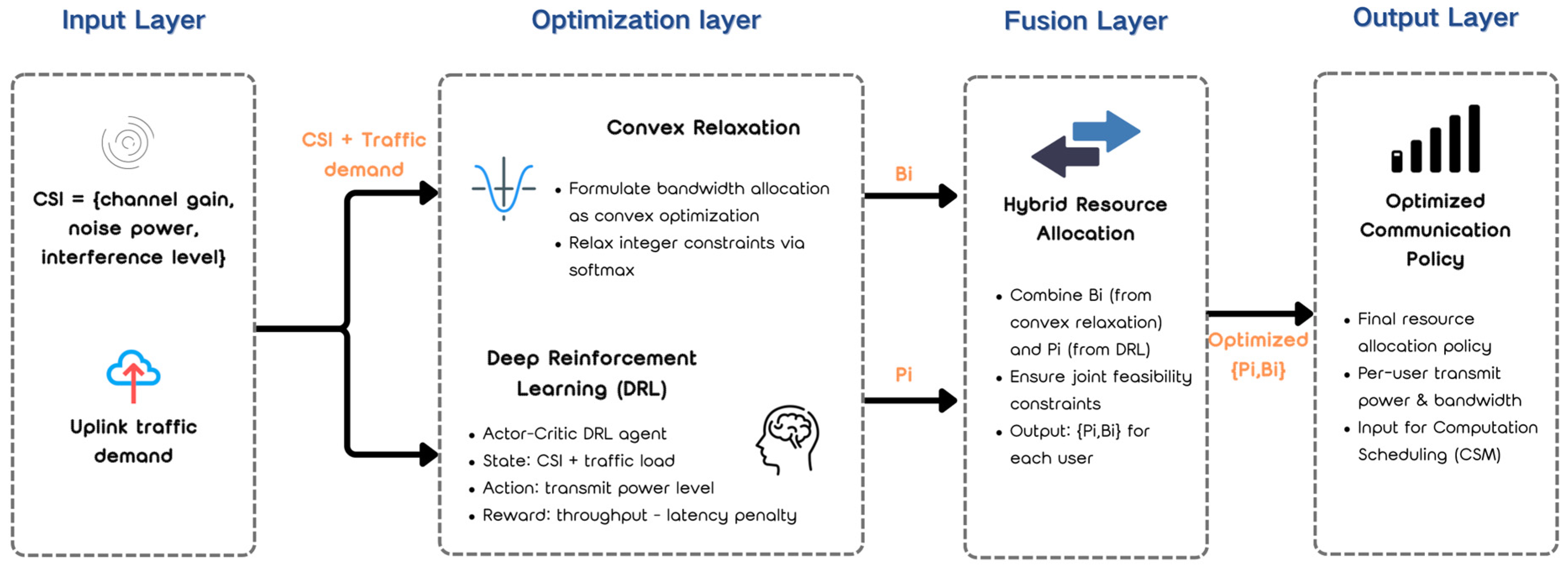8]. Our contributions are threefold. First, we designed a communication–computation co-optimization scheme that explicitly models the interplay between uplink bandwidth allocation, edge computing capacity, and FL convergence dynamics. Second, we propose a hybrid optimization strategy that integrates convex relaxation techniques with deep reinforcement learning-based policy adaptation, ensuring both theoretical tractability and adaptability to dynamic environments. Third, we incorporate a fairness-aware scheduling mechanism, which balances participation across heterogeneous devices and thereby improves robustness and inclusiveness of the FL process. Together, these innovations establish a holistic resource allocation paradigm that advances beyond existing communication-only or learning-only optimization approaches.